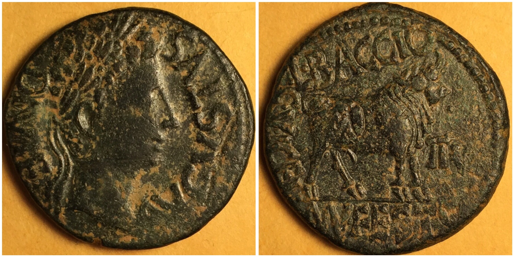 SPAIN, Celsa. Augustus. 27 BC-AD 14. Æ As (27mm, 11.99 g, 3h). L. Baggius and Mn. Flavius Festus, duoviri. Laureate head right / Bull standing right, head facing. RPC I 273; SNG Copenhagen 540.