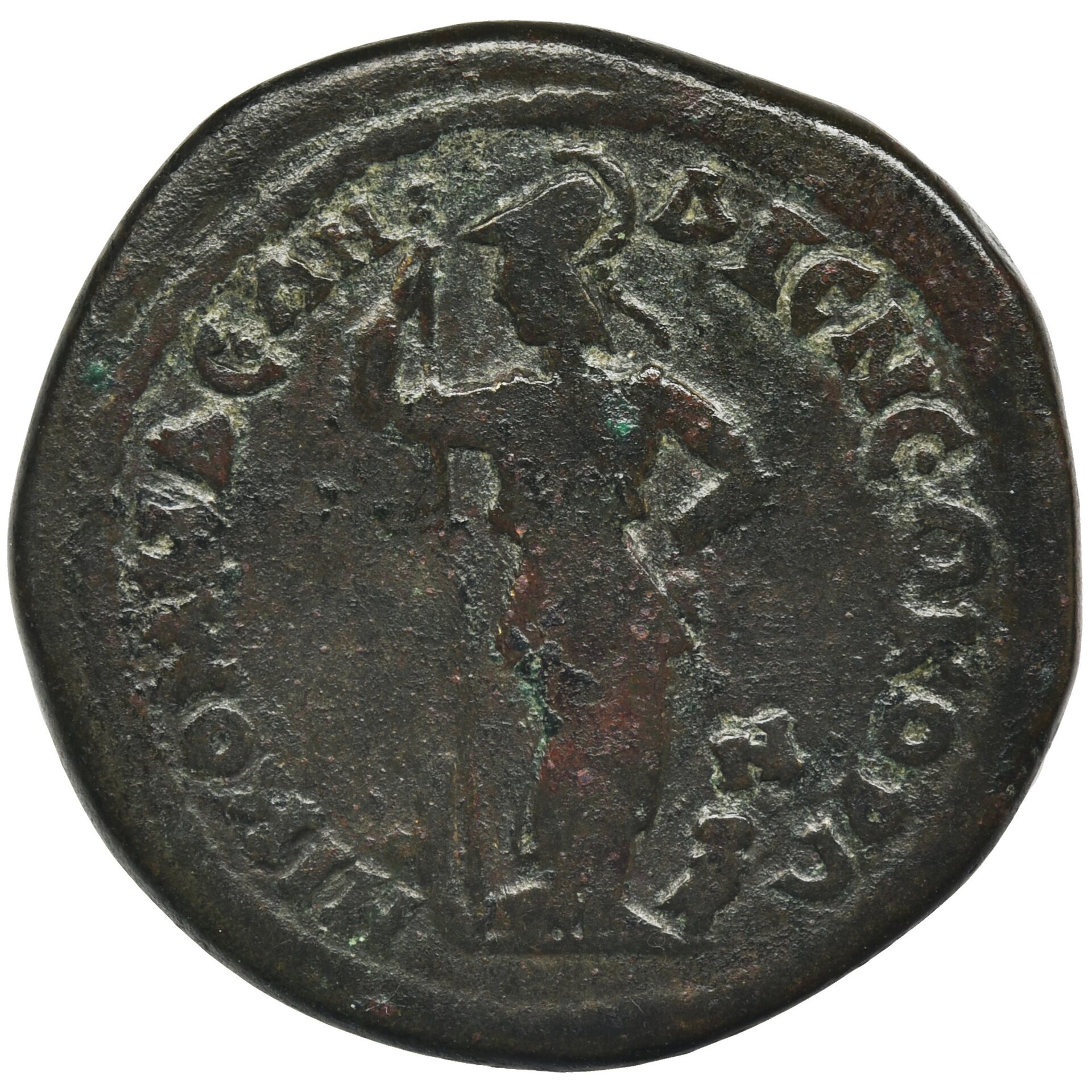 The one with the most legible inscriptions is the middle one, which I reproduce here: Note the obverse reads: ΑΝΤΩΝЄΙΝΟϹ ΑVΓVϹΤΟϹ. This is transliterated "Antoninus Augustus" (hint: it's not Antoninus Pius or anyone actually related to him). The reverse reads ΝΙΚΟΜΗΔЄΩΝ ΔΙϹ ΝЄΩΚΟΡΩΝ. This is translated as "of the Nicomedians, who have two Neocorates." The reverse features a goddess depicted with her usual attributes -- a helmet and her sacred animal, the owl. Hope that's enough to get you started.