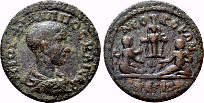 This type of reverse exists for Ephesus only, and only for the emperors Gordian III, Philip I the father, Philip II the son, and Trajan Decius (who was a distinguished general under Philip I, but later rebelled against him and won).