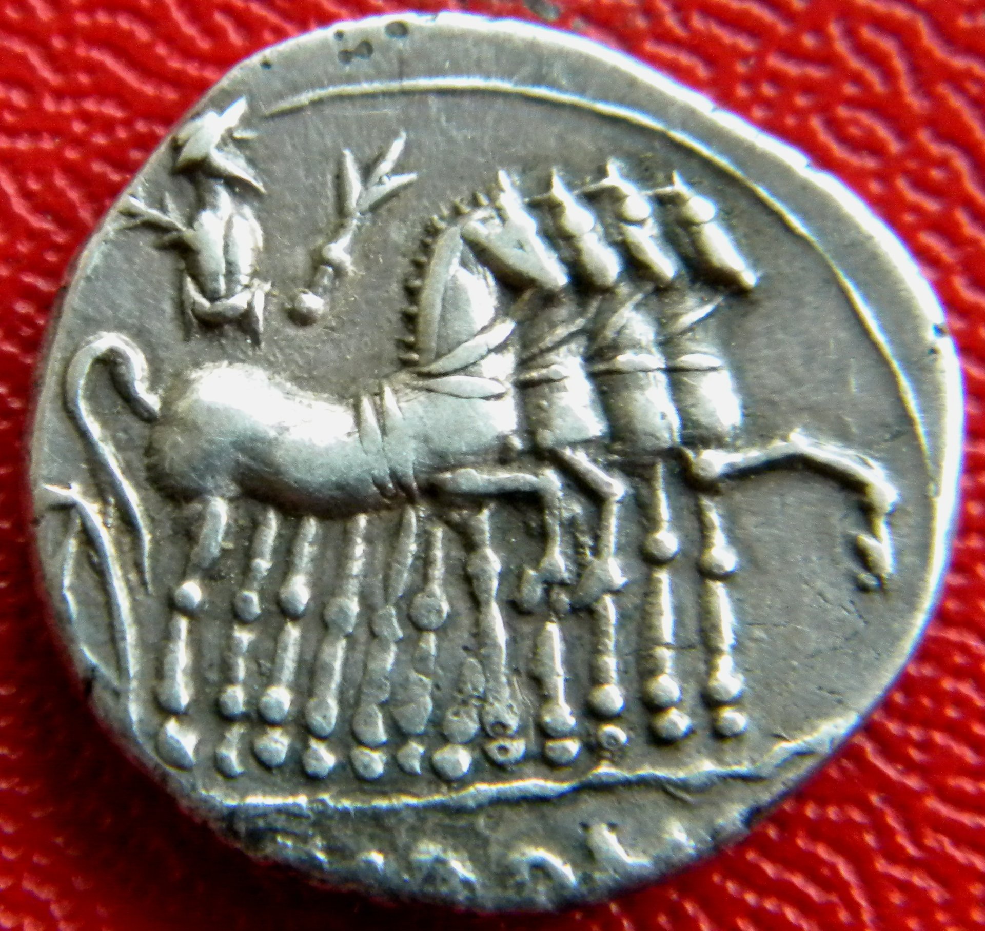 Very cool triumphal devices! It seems the closest I have (and several others on CT) is this empty 'Triumphal Chariot' issue... Roman Republic. L. Rubrius Dossenus, moneyer. AR Denarius minted at Rome, 87 BC. Laureate head right of Jupiter; to left, scepter. Reverse: Empty triumphal chariot right, surmounted by small figure of Victory. Sear 258; Rubria 1; Cr. 348/1; Syd. 705.