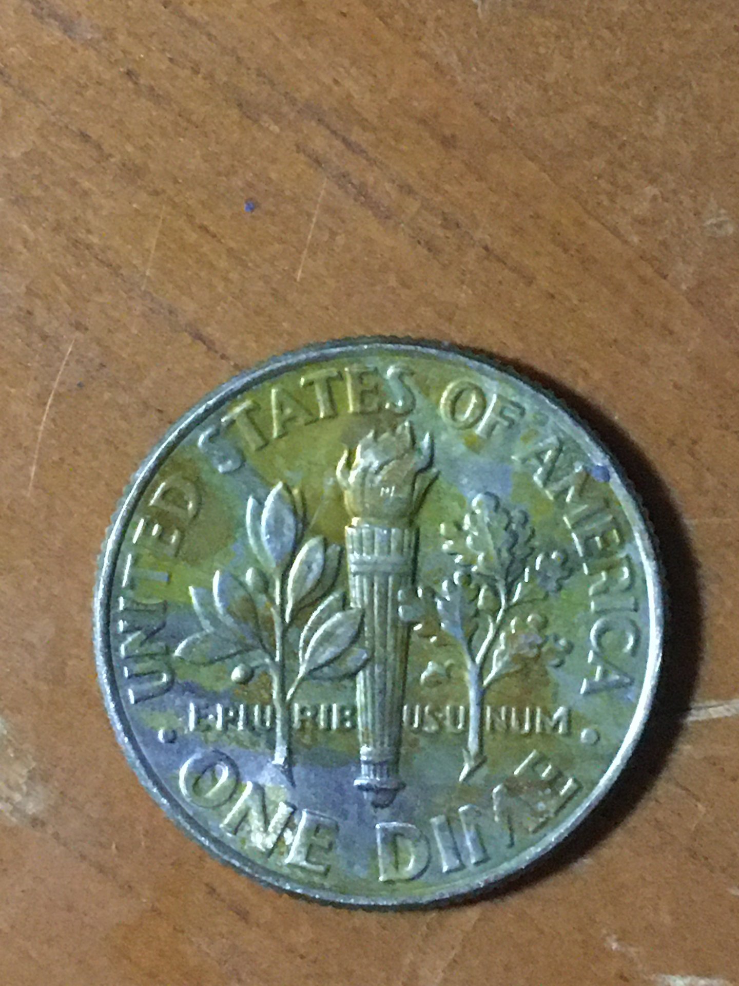 When your coin is so destroyed like the first one, even if there was some error, you probably couldn't see it through the damage. As for the second one, dimes are clad. The inner core is copper, and the outer sandwich layers are nickel and copper. Your coin does not have a different alloy mixed in. It's either glue, or some kind of stain. It could be environmental toning.