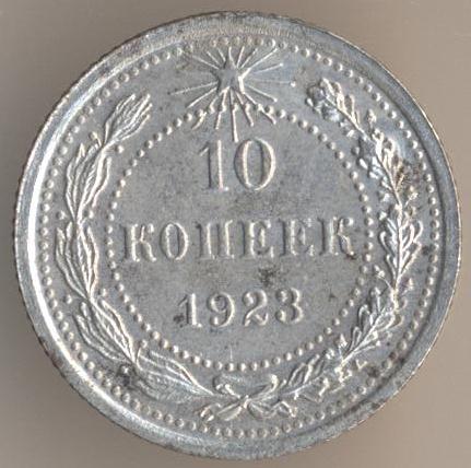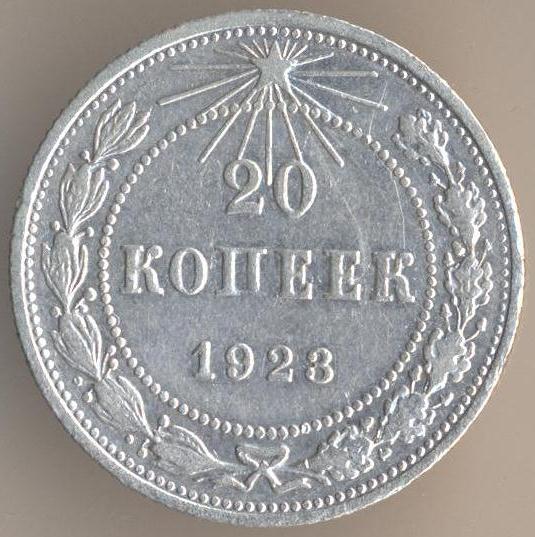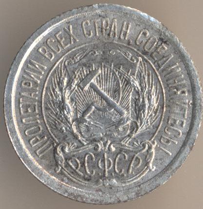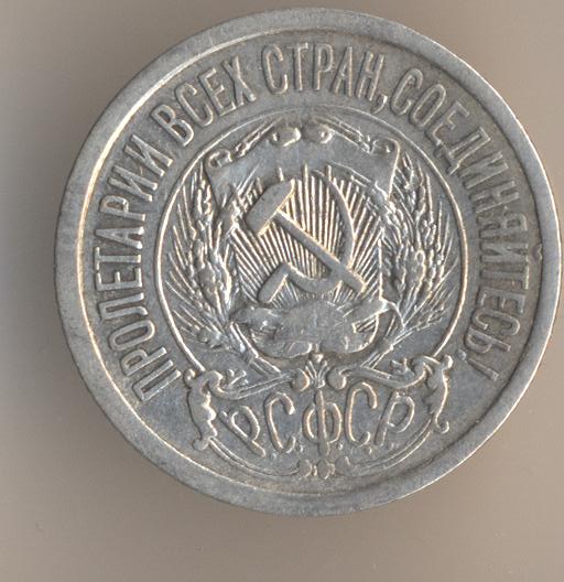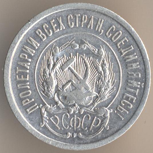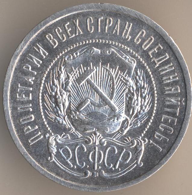 Here is an image of the coin: As Evgeny notes this coin was minted in 1922, dated 1921 and not circulated until 1924 when the ruble was finally revalued and backed by precious metals again. In 1924 the design was also updated: Both of these coins have the legend "Пролетарии всех стран, соединяйтесь!" or Workers of the World, Unite! The design change with the 1924 dated coin was necessitated by the formation of the USSR in 1922, the 1921 dated coin was issued under the Russian Soviet Federative Socialist Republic.