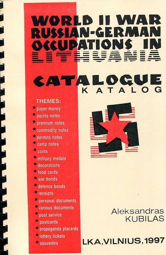 WWII Russian- German Occupations of Lithuania by Aleksandras Kubilas 1997, Vilnius, Lithuania. ISBN 9986-9223-0-5. Only 100 copies of this book were printed. Clear plastic and card covers with plastic binding. Size 8.75 x 11.75 inches, 200 pages, English text, extensively illustrated in black and white. Covers every type of collectible resulting from the Russian and German occupations of Lithuania during WWII. Price estimates are given in USA dollars. One copy only, $20 post paid to any US address. Foreign addresses postage to be determined by postal rates and only sent at the buyer’s risk. Thanks, Fred