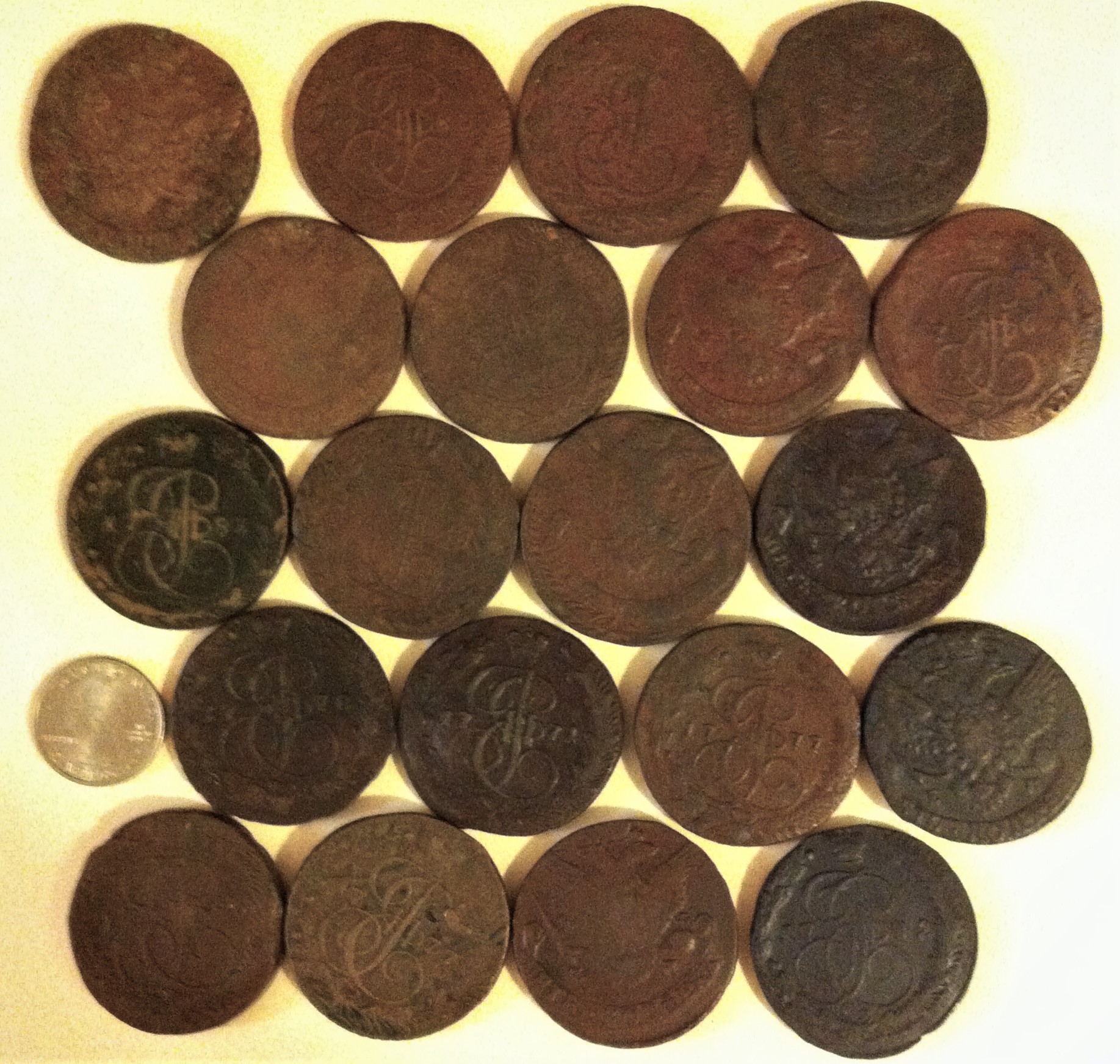 Russian "whopper coppers" (5-kopek pieces): huge, fun coins from the 1700s that won't break the bank