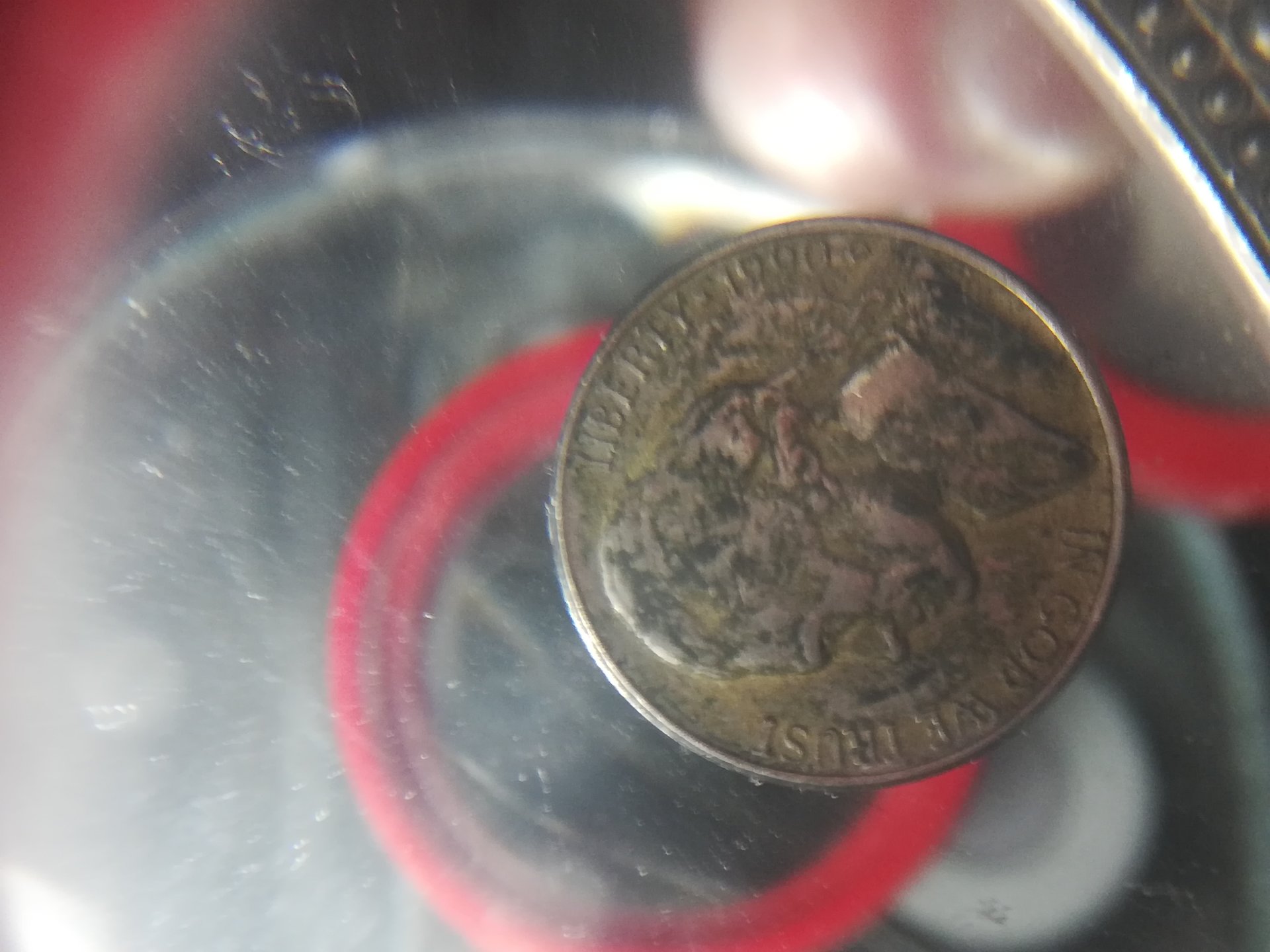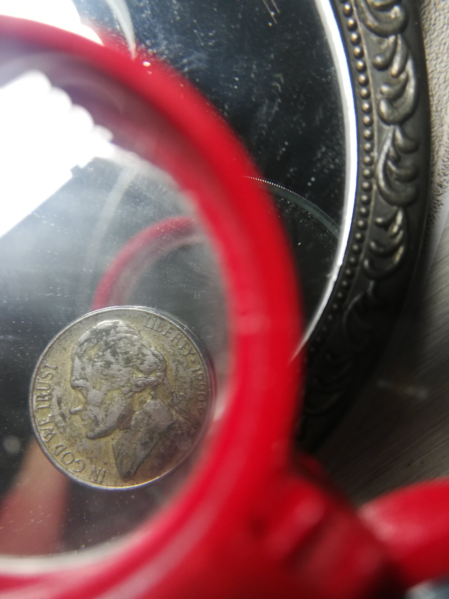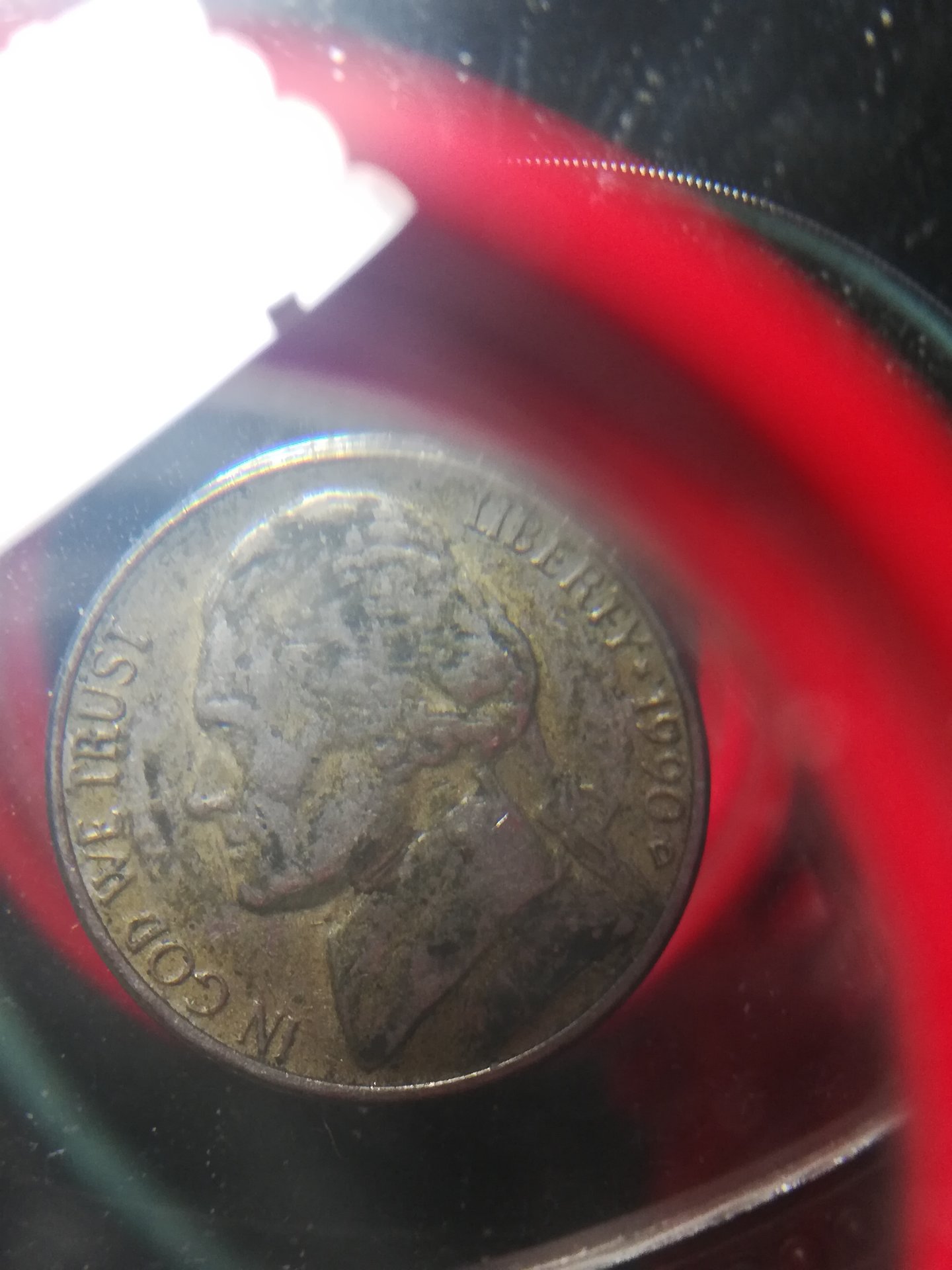 Hi found a 1990 d nickel, at first it looks like rust, but i look at it again, and i saw some doubling on the letters and on the obverse there seem to be like another head popping out from the coin. Please let know what you see from this coin.
