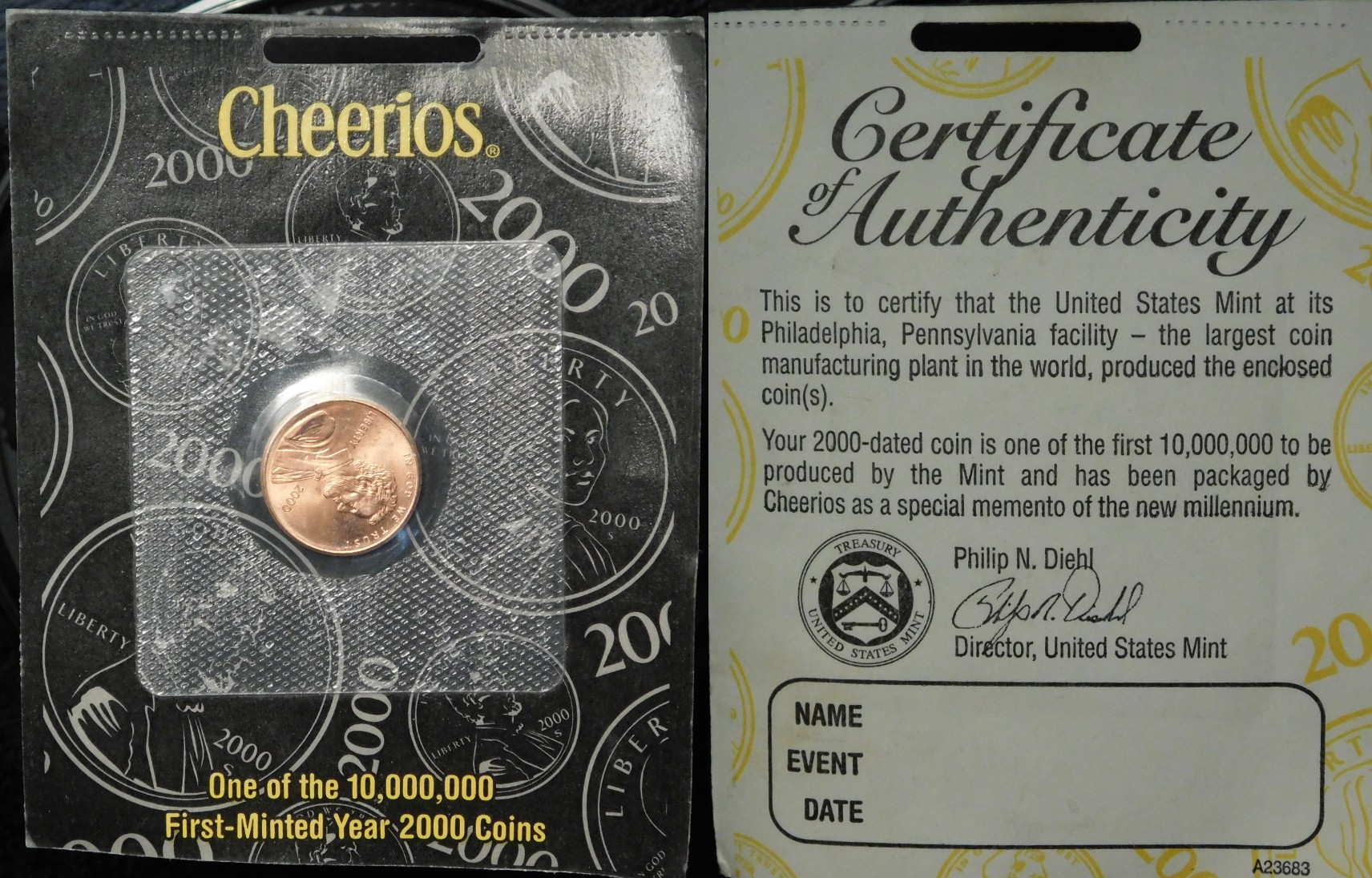 5,503,200,000 pennies minted in 2000. Only ten million were put in Cheerios packages. Has to be worth at least a dollar. A dollar will not buy much anymore. Not even a quart of gas or a loaf of good quality bread.