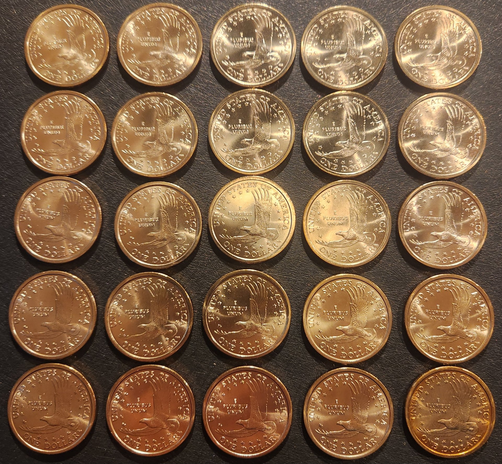The moment of truth is here. I'm unwrapping the roll as I type this: I'm enthusiastic! I apparently picked up this roll in its inaugural year. Every Sacajawea is a 2000-P. And since it isn't a mint wrapped roll, it is possible the bank rewrapped this roll with a Cheerio in it. I have not looked at any of the reverses yet. Nor have I scoured the obverse for any anomalies. Here's a pic of the unsearched obverses. I'm hoping someone with knowledge of Sacajawea's can tell me what to look for.