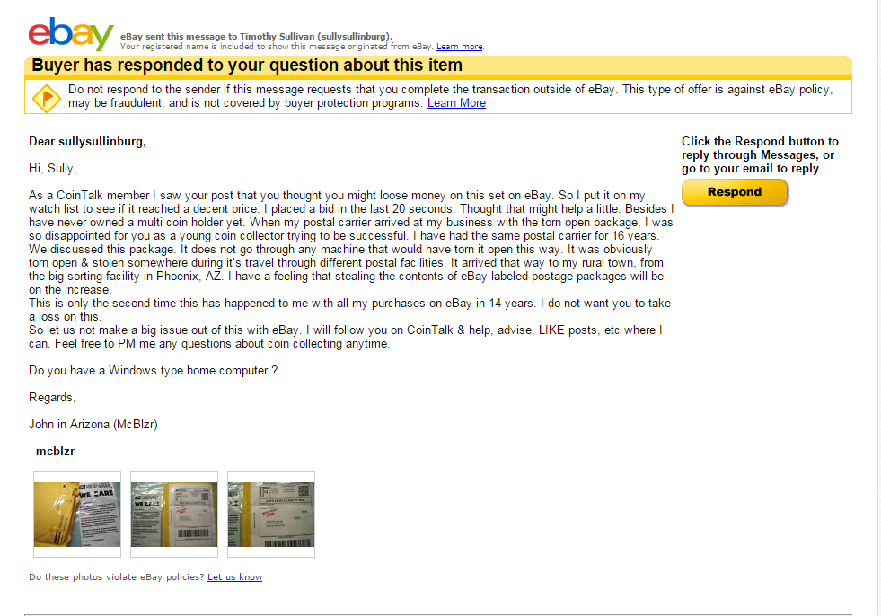 Good advice, I think. Then you must get tracking from the USPS website?? Or what, do you journey to the post office to insure and track? I will think long and hard about your advice!! I have seen coins packaged (taped to a page) in a magazine (like TIME), the package did not appear to contain any coins and you could not feel them. I often write, DO NOT BEND PICTURES on a hard type thin package with coins inside, which you cannot feel or sense (weight wise). Still young Tony do you really think the EBAY mailing label is totally a mistake? I have had two coin packages opened/stolen while in transit to me. Both were opened with a knife blade or razor, a small slice, and both occurred in a southern Calif mail facility. I actually suspect a postal employee, a quick experienced one.