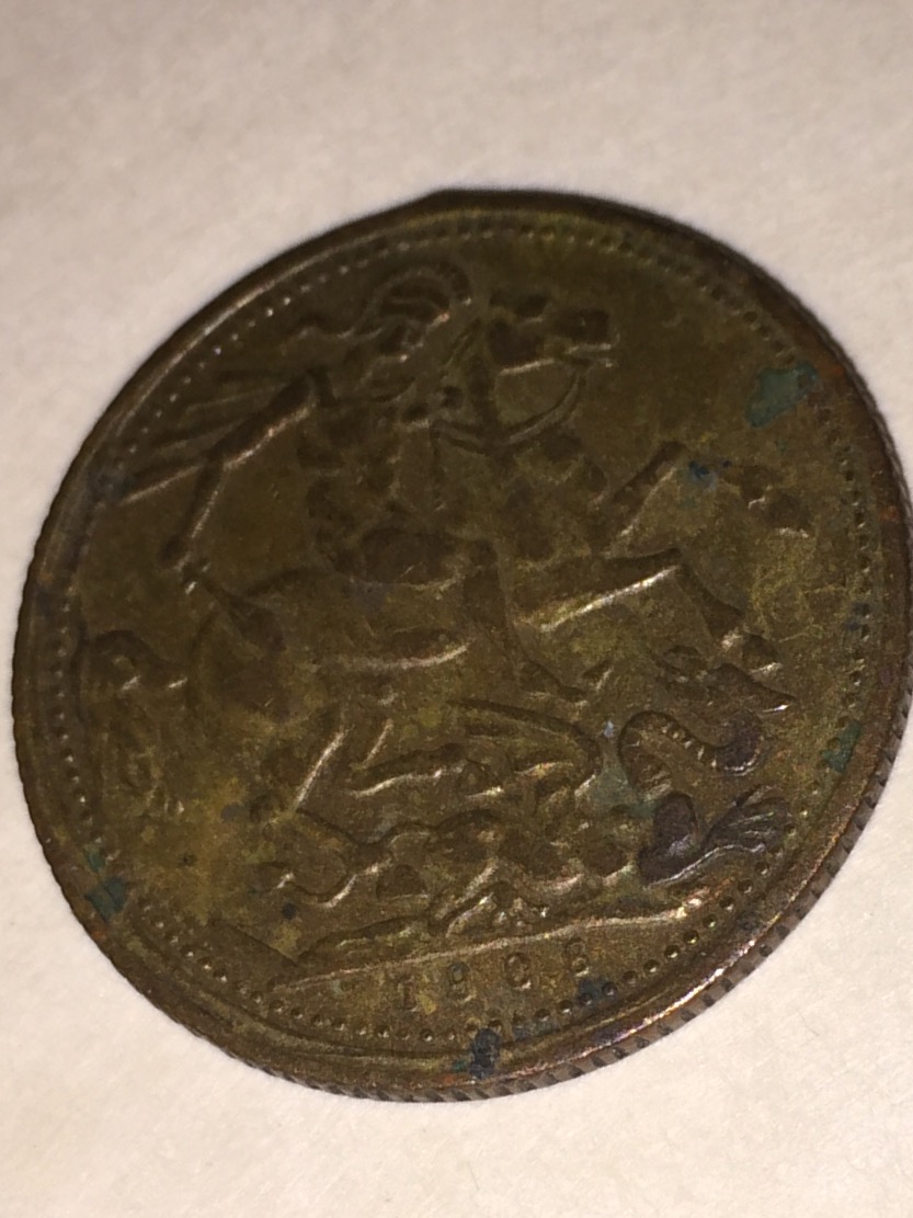 Looks a token of some kind. It's a crude cartoon version of St. George slaying a dragon, as you'd see on a sovereign. But I doubt it was meant to fool anyone.