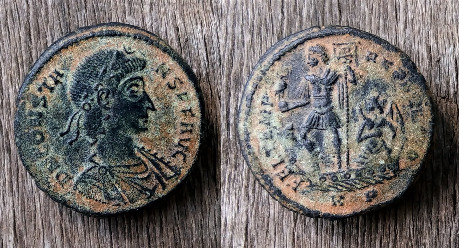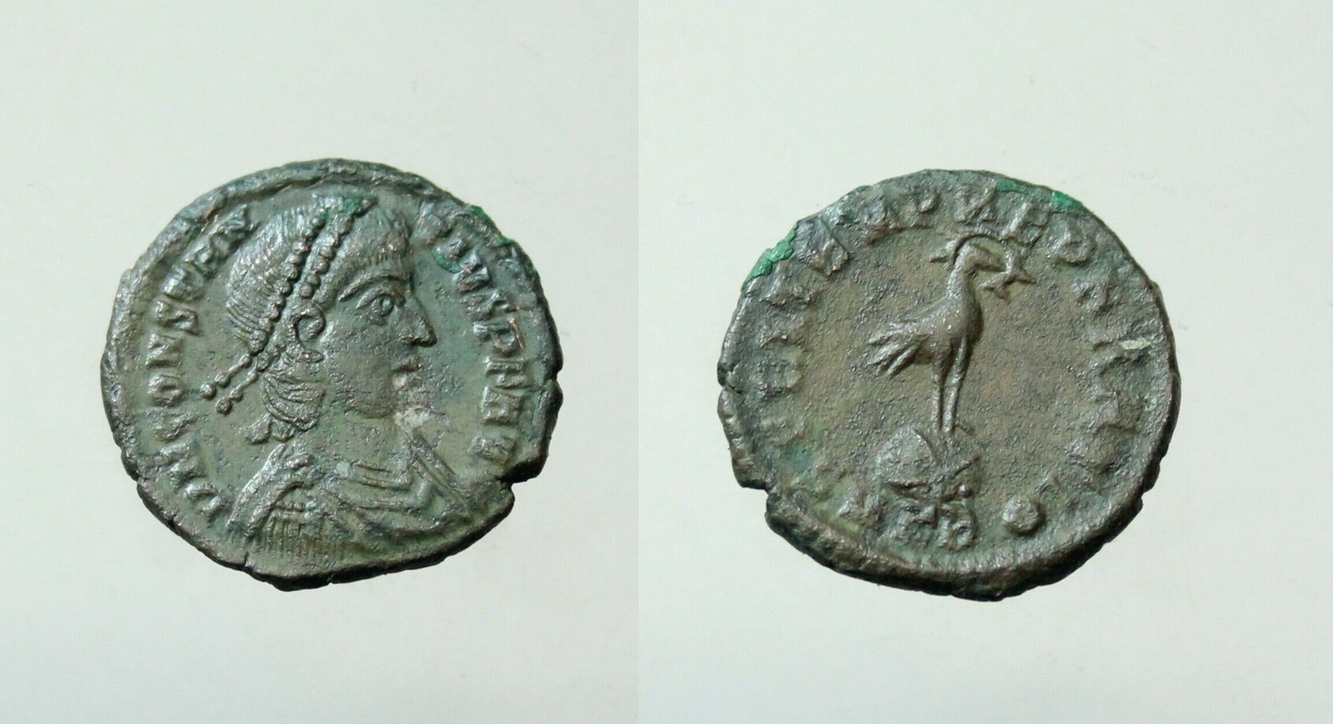 Two FEL TEMP issues, both unlisted in RIC: Constans AE25mm 5.60g billon bronze maiorina, minted at Rome, cca. 348-349. DN CONSTAN - NS PF AVG; laurel and rosette-diademed draped cuirassed bust r. FEL TEMP - REPARATIO; Emperor in military dress standing left on galley, holding Phoenix on globe and labarum, in the stern sits Victory steering the ship; ϵ in left field. RP in exergue cf RIC VIII Rome 130, R2. Notes: A rare specimen, unlisted for officina from a scarce issue for Constans at Rome. Officina P seems to be missing from Nummus Bible also. Interesting patina, possibly from the Levant area, marking the circulation of Western-minted coinage across the Eastern part of the Empire as a result of the common type adopted by all mints. And just the Phoenix on globe, as held by Constans, but this time by the Eastern brother: Constantius II AE18mm 2.86g, half centenionalis(?), minted at Cyzicus, cca. 348. DN CONSTAN - TIVS PF AVG; pearl-diademed draped cuirassed bust r. FEL TEMP - REPARATIO; Phoenix on globe to right, with nimbate head SMKB in exergue cf. RIC VIII Cyzicus 88, R Notes: This is probably the first series of this small denomination in the FEL TEMP coinage at Cyzicus and Constantius II is not attested in this emission, although another specimen is known, with officina A, listed by Nummus Bible here. Being an early issue of this type, it was probably smaller than the later (main) one marked with * in right field. Detail from the maiorna with the emperor holding Phoenix on globe: