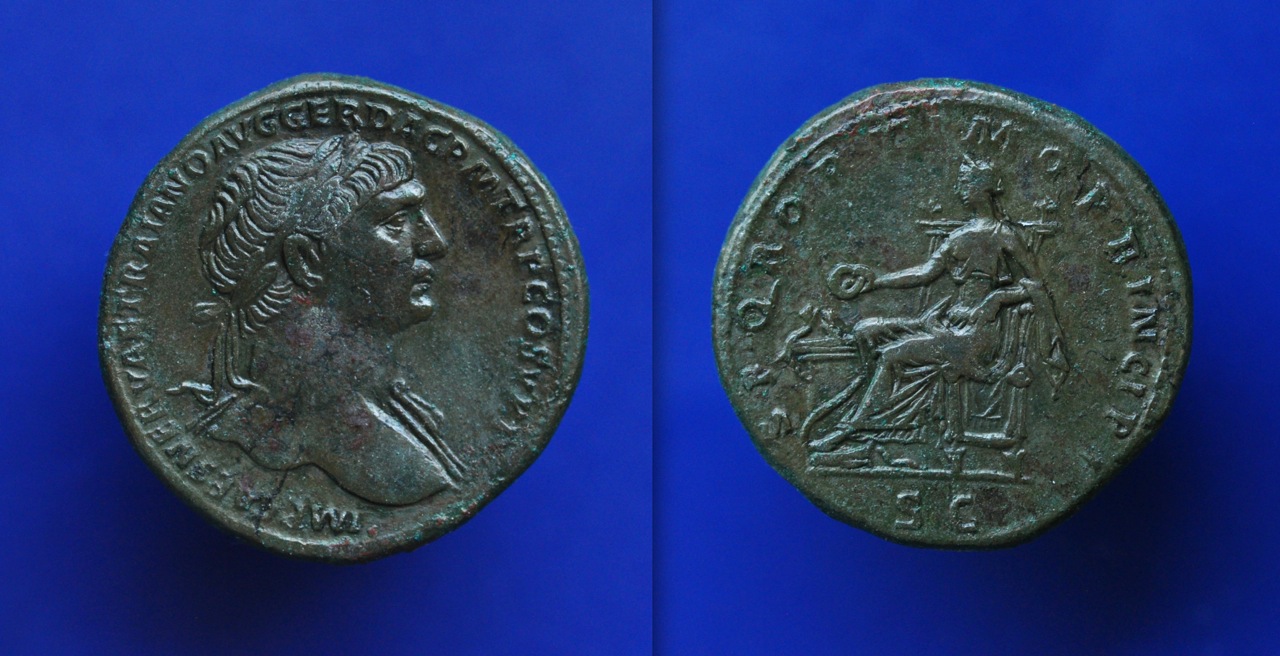 As I continue to reorganize my collection I found another old favorite of mine Sestertius of Trajan 109-110 AD Obv Bust right laureate drapery on far shoulder. Rv. Salus seated left feeding snake rising from altar RIC 515 Woytek 335b 27.46 grms 32mm Photo by W. Hansen Xtrajans3.jpg