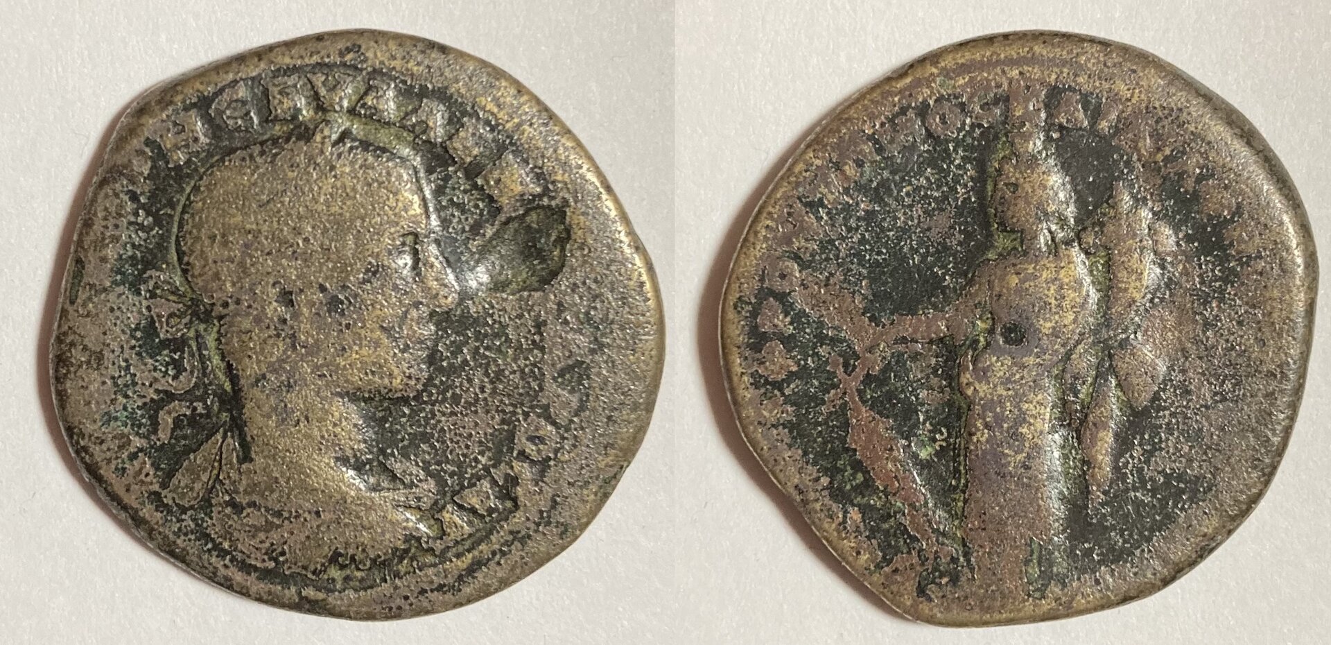 Rephotographed this one: Volusian, AD 251-253. Roman provincial Æ 28.2 mm, 11.26 g, 7 h. Cilicia, Seleucia ad Calycadnum, AD 251-253. Obv: ΑV Κ ΓΑ ΟVΙΒ ϹΑΒΙΝ ΓΑΛΛΟϹ, radiate, draped and cuirassed bust, right. Rev: ϹЄΛЄVΚЄ-ΩΝ ΤΩ Π|ΡΟϹ Κ-ΑΛV|ΔΝ, Athena advancing right, brandishing spear, holding shield, attacking serpent-footed giant hurling stone with right hand. Refs: RPC IX, 1336; BMC 21.141,54; SNG von Aulock 5851; RG 4480 (SNG France 1055); SNG Levante 780. Notes: Double die match to SNG Levante 780 and RG 4480=SNG France 1055 (BnF); obverse die match to BMC 54.