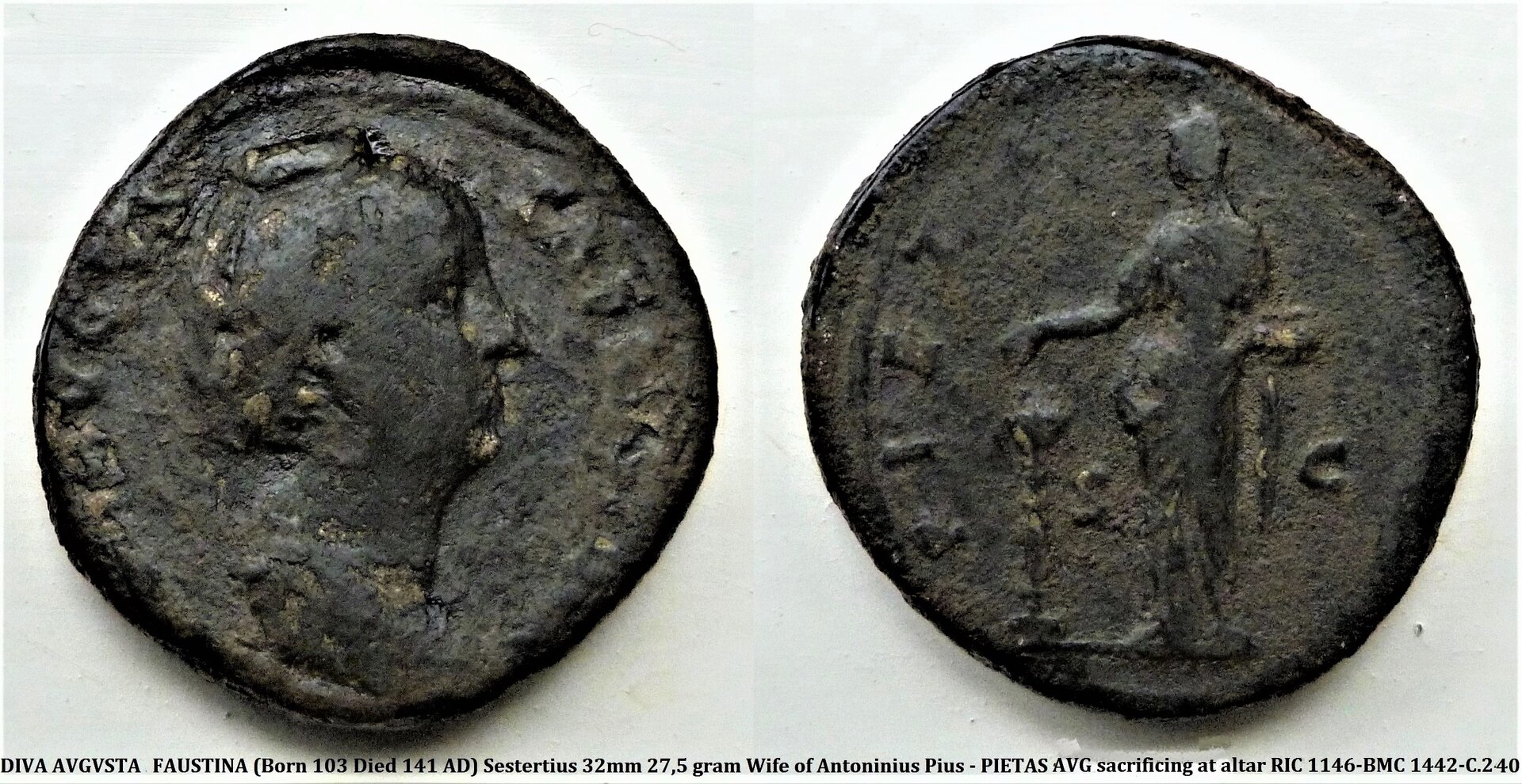 There were various phases of issues for Diva Faustina, not for the Pietas issues in particular, though the PIETAS issues appear in the first (AD 140-142) and second (AD 143-44) phases.