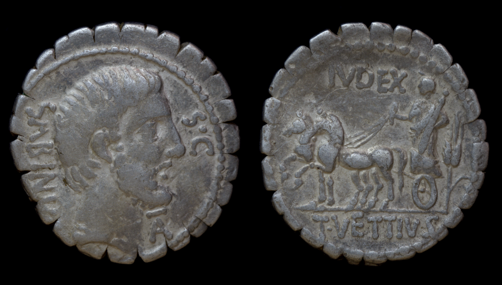 I went in with high hopes and a long wishlist - I didn't get one from the sock drawer - but I did end up with this one.... T. Vettius Sabinus, 66 BC, AR denarius (Silver, 20mm, 4.00g, 7h), Rome. Obv: SABINVS - S•C, bare and bearded head of King Tatius to right; below chin, monogram of TA Rev: IVDEX / T•VETTVS Togate figure in slow biga to left, holding reins in his right hand and scepter in his left; behind, grain ears Ref: Crawford 404/1 My Gallery of RR favorites