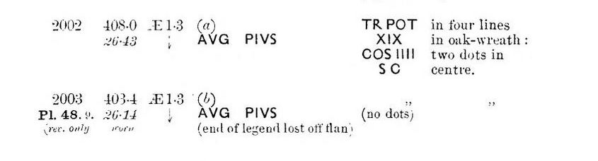 The only thing I could find about the purpose of the issue is this brief explanation on p. xc of BMCRE4: Dedications of laurel-wreaths seem to call attention to the fact that the Emperor had reached his nineteenth tribunician year. Preparations in advance for the celebrations of 'vota' are suggested. You've made a slight error in your attribution. You catalog this as BMC 2003; it's actually 2002. Here's the listing: BMCRE 2002 has a laureate head, right, (bust a), like yours. BMCRE 2003 has a laureate bust, r., with slight drapery on far shoulder (bust b). Here are photos of the specimens in the British Museum. 2002: 2003: