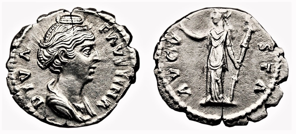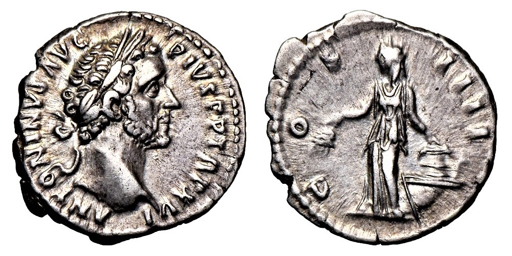 Here is a Husband and Wife, on separate coins, who always made a fine pair. Antoninus Pius AR denarius, Rome, AD 152-153. 18 mm, 3.35 g. ANTONINVS AVG PIVS PP TR P XVI, laureate head right. / COS IIII, Annona standing left, holding corn-ears in left hand and resting right hand on modius set on prow to right. RIC 221; RSC 290; BMCRE 520 Faustina Sr AR Denarius, RIC 361, RSC 101a, BMC 417, SEAR 4583. DIVA FAVSTINA, with elaborate hairstyle and draped bust right / AVGV-STA, Ceres standing left, long hair tied behind, raising right hand & holding long torch with left. Rome mint, A.D. 141. 3,0 g - 15 mm