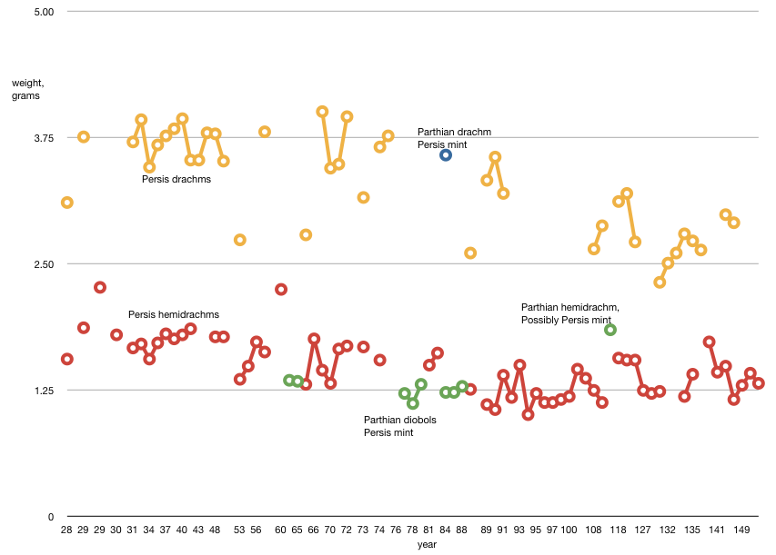 Welcome, Glen. That's a nice bit of research. The chart you created does indeed clarify the trend over time. Well done. Congrats on the Osroes I hemidrachm.That is quite an important coin. I believe that since Sellwood's 1989 essay in The Numismatic Chronicle #149 was published, two more have come to market - one now residing in the extensive Schatz collection.