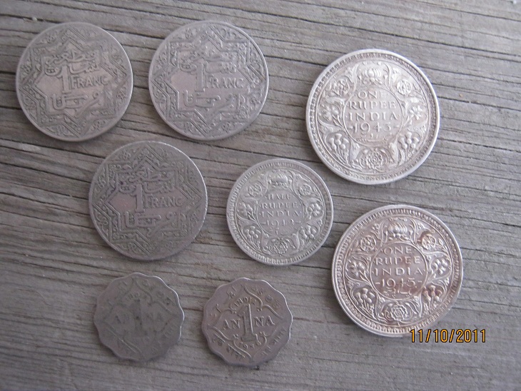 The three Indian coins are indeed 50% silver, the other coins are all copper-nickel. The "1 franc" coins are from Morocco. Probably 1921 but there are different mint marks.