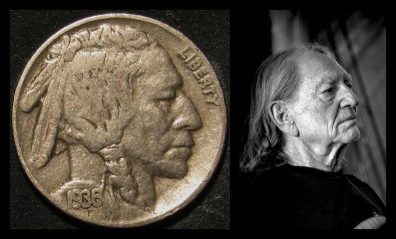 While watching a Highwayman video this morning and going through a bag of buffalo nickels it struck me that Willie Nelson, in his latter years, bears a strong resemblence to the Chief on the Buff. I couldn't find a total side profile of Willie but I think this pic suffices. Anybody else have any good "separated at birth" examples?