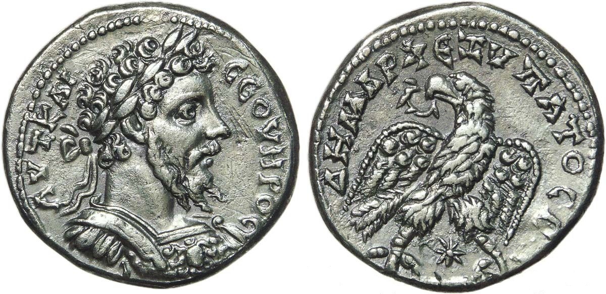 SEPTIMIUS SEVERUS AR Drachm OBVERSE: AY Λ CЄΠ CЄOYHPOC, laureate head right REVERSE: MHTPOΠO KAICAPIAC, Mt. Argaeus surmounted by star, ETЄ in ex Struck at Cappadocia, Caesarea, Year 5=A.D. 196/7 2.58 g, 17mm Sydenham 395