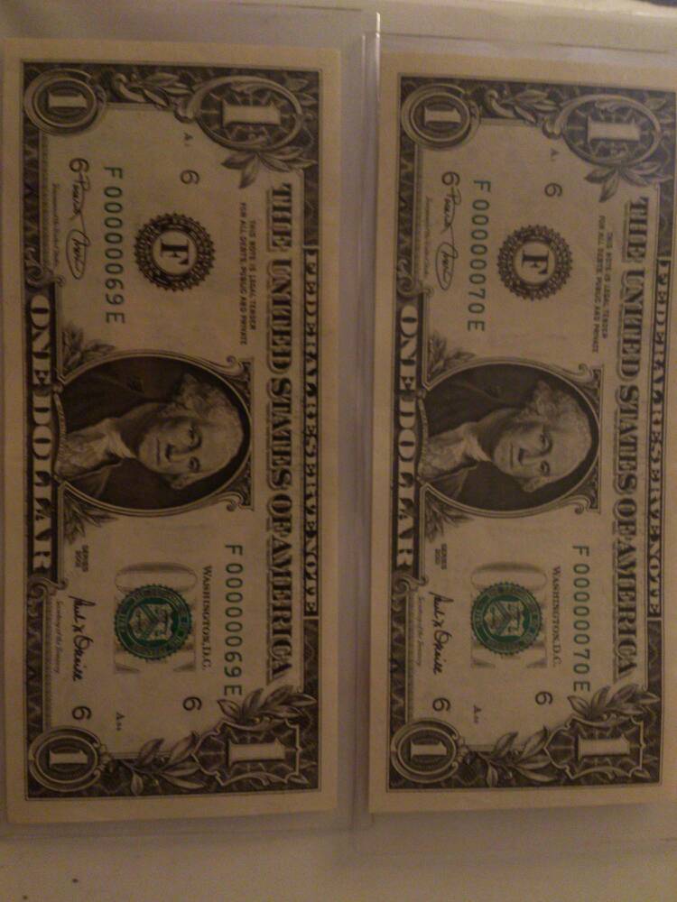 Well, if eBay is your outlet, I had a '06 $1 B00000060C that sold for about $50, and it couldn't have been more than F/VF. While Funkee has a point that these notes probably shouldn't bring the dollars that they do, there are people out there who will spend some dollars on these low modern serials. My guess would be $80 each, $230 if sold as a sequential pair.