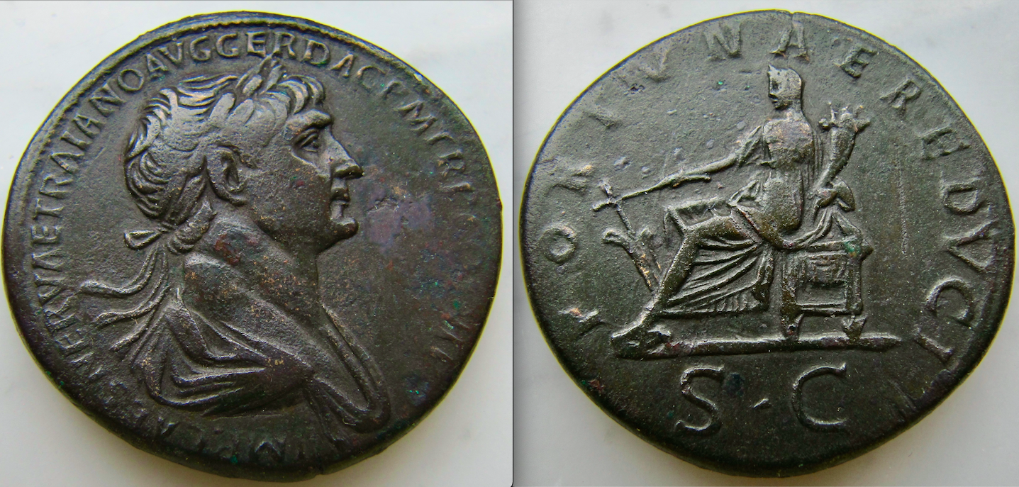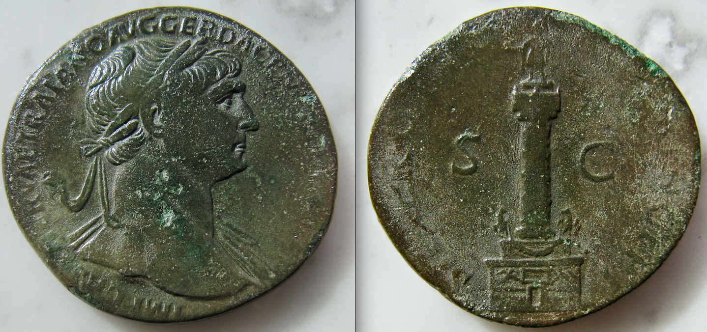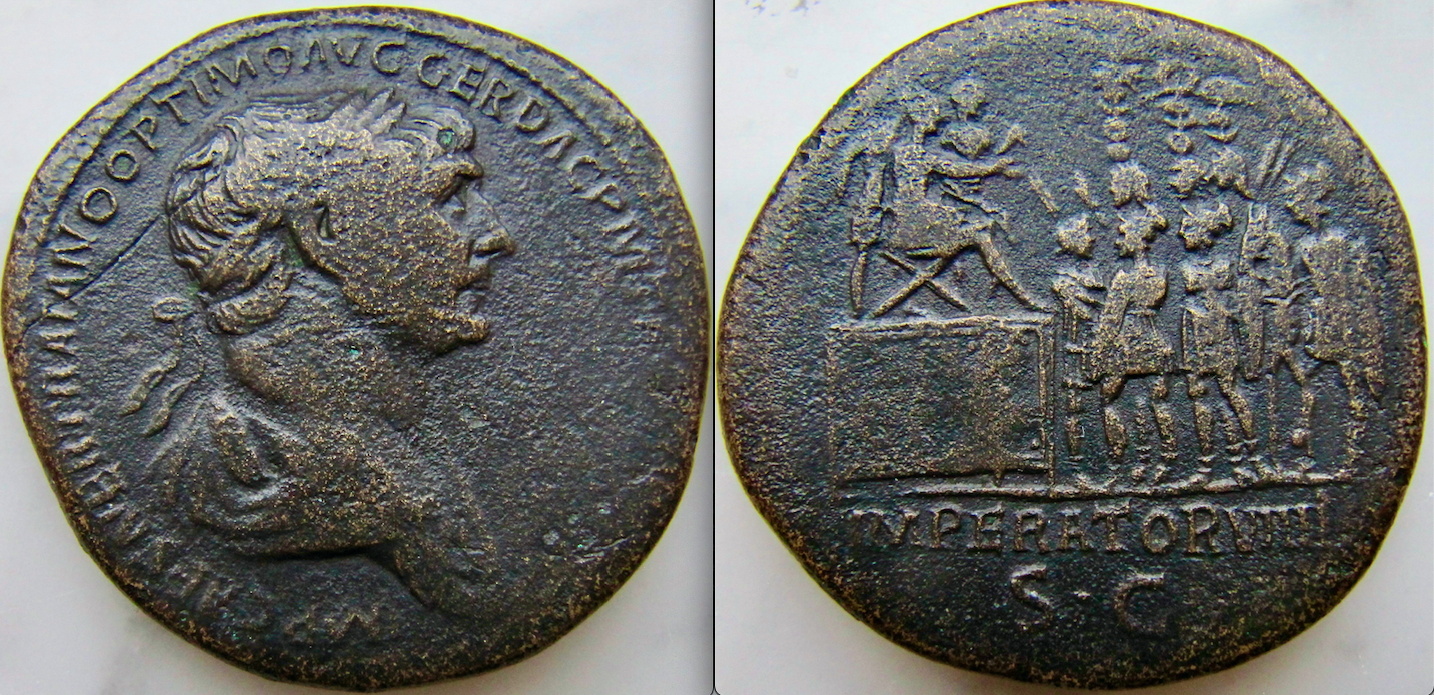 I have two to contribute. One has a misshapen finish the other has a deep green patina Gaius Vibius Trebonianus Gallus. AE Sestertius, Rome, AD 251-252 IMP CAES C VIBIVS TREBONIANVS GALLVS AVG, laureate, draped bust right / PIETAS AVGG, S-C, Pietas standing facing before lit altar, raising both hands. RIC 117a; Cohen 86; Sear 9676. 23.15g. 28x31mm Faustina Junior (Augusta, 147-175). Orichalcum Sestertius (31mm, 21.68g, 12h). Rome, 161-4. Obverse FAVSTINA AVGVSTA: Bust of Faustina the Younger, draped, sometimes diademed, hair elaborately waved in nearly vertical lines and fastened in a low chignon at back of head, down cheek, curls, right Reverse SAECVLI FELICIT S C: Throne (pulvinar), draped and ornamented, on which are two baby boys, Commodus and Antoninus, seated face to face, with stars above their heads RIC III 1665. Sear 5282, Cohen 193. BMC 937.
