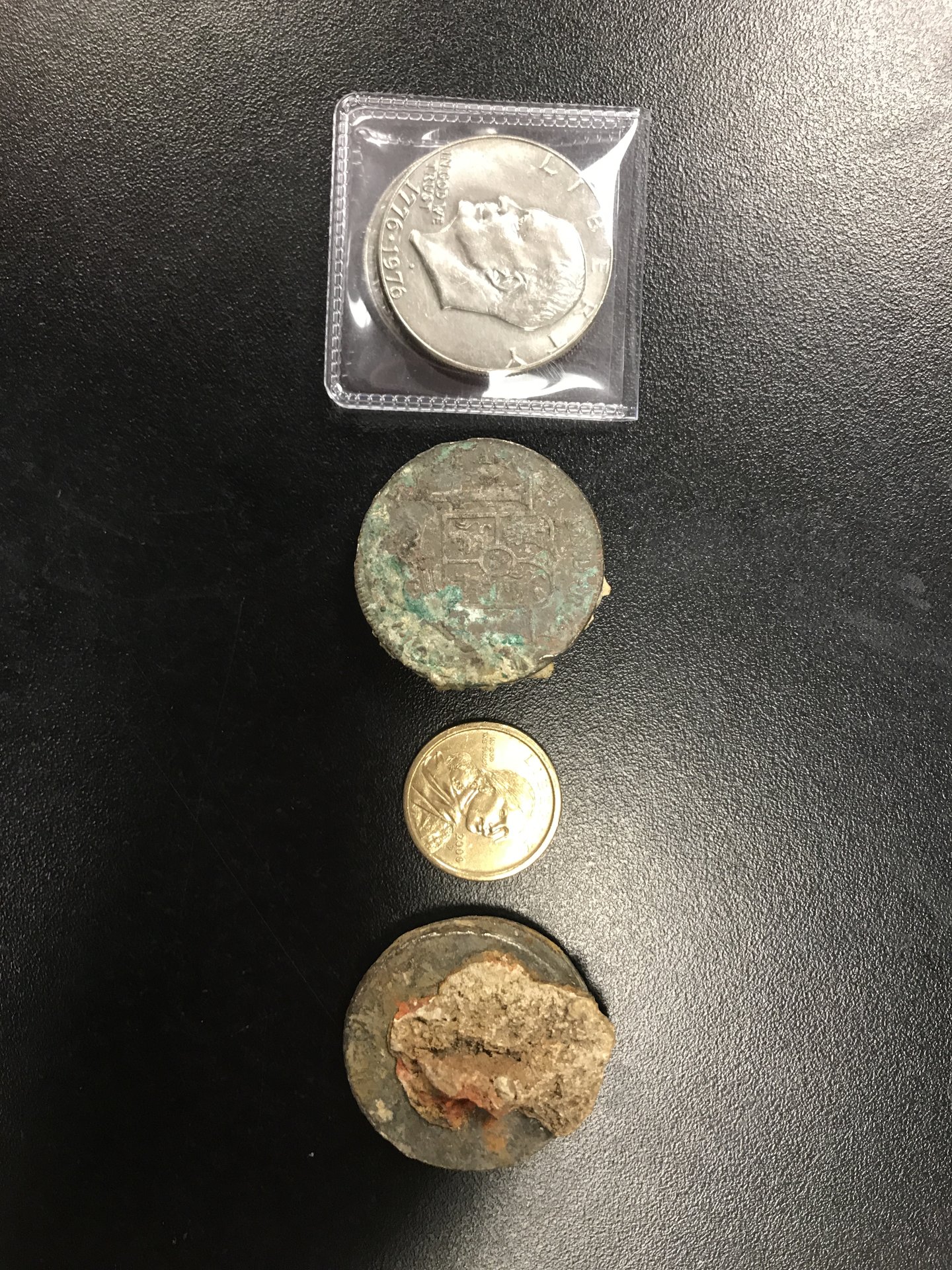 The 6 coins I purchased are in 2 clumps of 3 coins. The weight would include 3 coins plus the attached coral/rock. The diameter is approximately the same as an Eisenhower dollar. I don’t have any single coins. Please see the attached photo. Thank you for your comments.