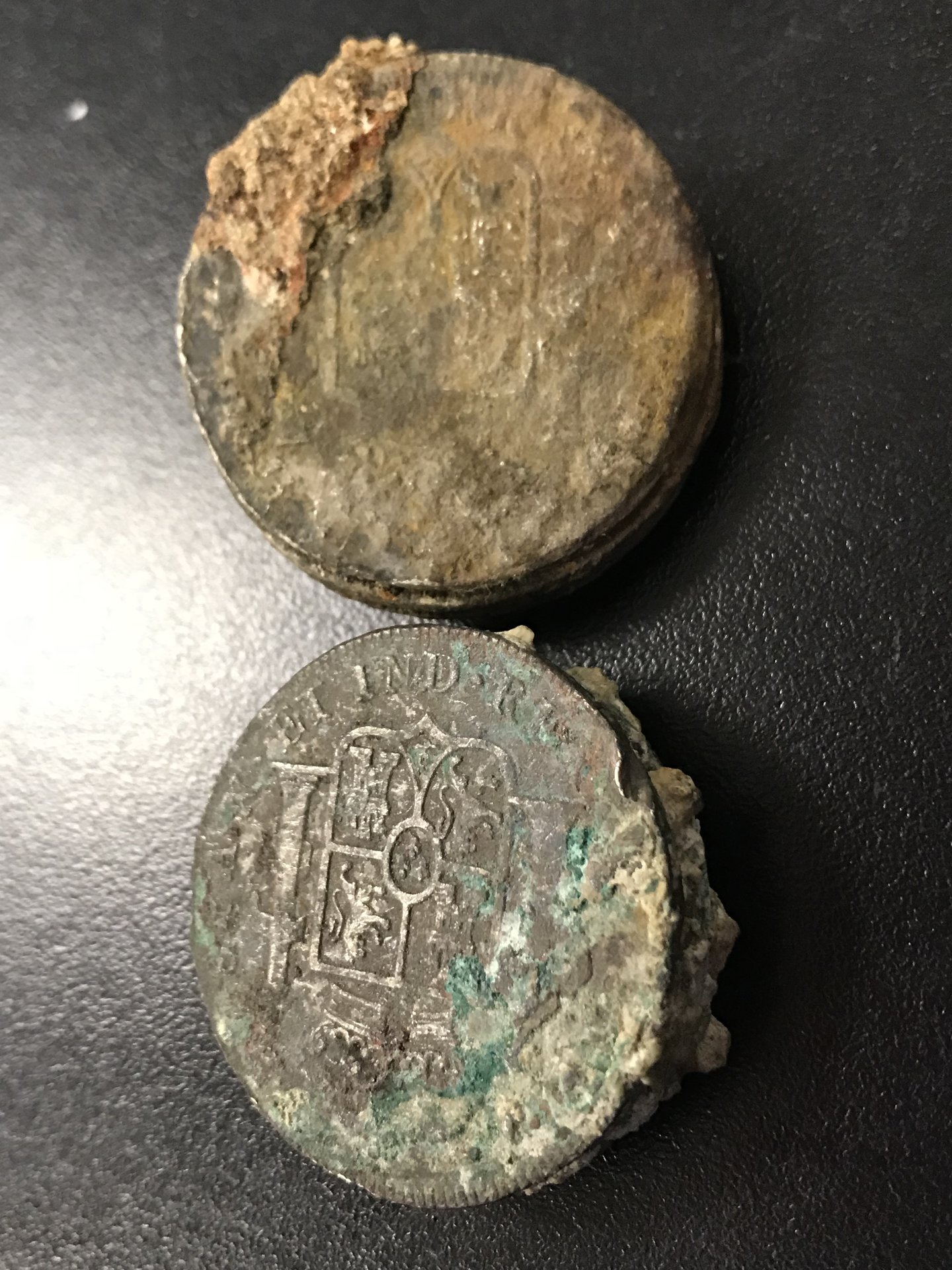 Not much one can say about them without better pictures, which would be difficult since they are fused into a solid block. However, it is obvious these are from the Spanish New World mints, more than likely Mexico City, and that they are of the 'newer' style, ie not the 'Dos Mundos' type. That means they are from the reign of Carlos III, Carlos IV or Ferdinand VII. The newer type was coined as of 1773 approx. Since you have them in-hand, you should be able to make out the mint where the coins were struck. This is located on the peripheral legend left of the base of the Column on reverse (Pillars of Hercules). Mexico City mint is abbreviated Mo (with small O over the M), Lima, Peru is LMAE in ligature, Potosi, Alto Peru (Bolivia) is PTS in ligature, Santiago, Chile is So (small O on top of S). Again, since you have the lumps in-hand, turn them over and see if you can see the portrait of the king. Treasure coins are exciting. I was very lucky to be able to buy this 8 escudos recovered of the wreck of the Nuestra Senora de la Luz which sank of Montevideo on the River Plate on its way to Spain, around 1752. Some of the treasure was salvaged in 1992 and auctioned by Sothebys. Most of the 'Peluconas' (8 escudo coins) recovered from the wreck were struck at the Spanish colonial mint of Santiago in 1750 and 1751. 8 Escudos from the wreck of the Nuestra Senora de la Luz: