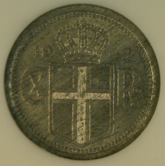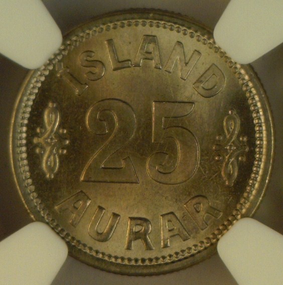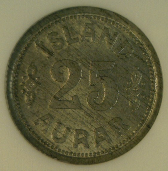I'm taking a survey of all the Icelandic coins from 1922 to 1942 in all grades from EX-Fine and up for a book that I hope to publish in the next two years. All coins can be either raw or slabed by any of the TPG'er, Now I don't want you to post pictures of any coin that is slabed with the certifcation numbers on the slab in the picture because I don't want anyone to use your photo's. The objective of this book is to inform and educate collectors of Icelandic coins and to provide as much information as I possibly can since no one has really written anything about them. I have a web site www.coinoficeland.com but it has pretty much come to a stand still for a lack of a really good camera that could be used to take pictures like a member here Siggi has posted I would ask siggi to take the pictures but he's in Iceland and I'm here in the U.S. So if anyone would like to help I would greatly appreciate it and any picture you allow me to use in my book,,,You would be given credit for,,,,With your permission of course. I would also like to know of anything that might be a new varietry, mint error or anything that just odd about the coin. Thank you Gudni.... aka Tony To get this started i'm posting one of mine NGC MS-65 1937 25 Aurar Far 7 Now let's see your's.