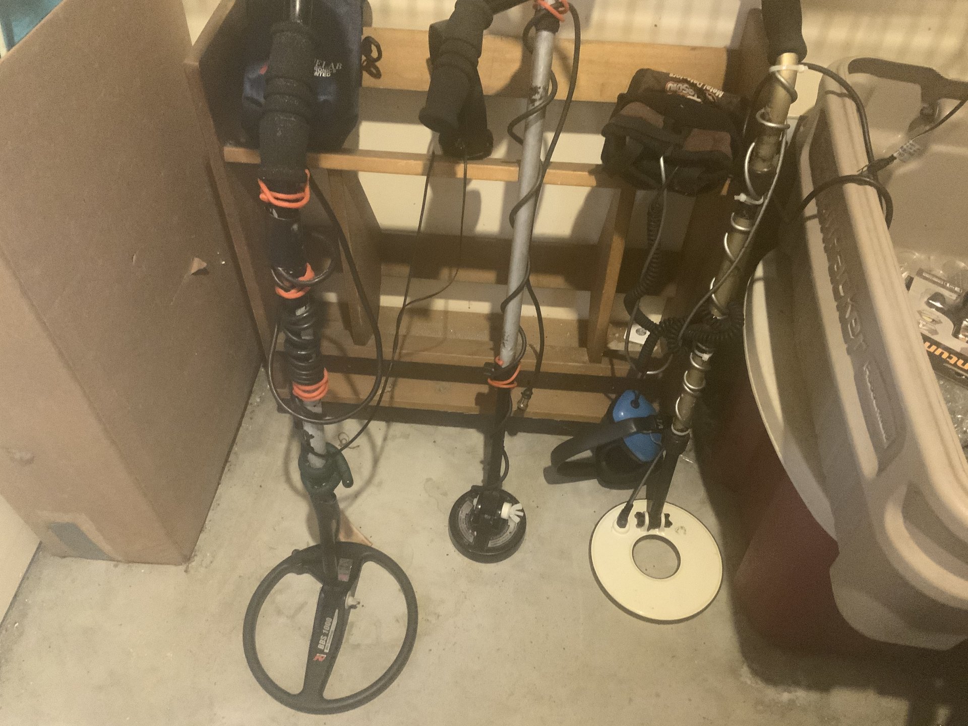 The metal detectors on the left and center are my Sovereign Metal Detectors by Minelab. Excellent beach machines but not waterproof. The machine on the right is my Sand Shark by Tesoro, another good beach machine that can be used 200 feet deep.