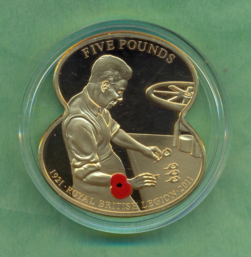 Guernsey £5 coin in the shape of a poppy--90 years of the british legion---the flanders poppy being to symbol of the british legion,sold every year in the uk to raise funds for ex-serviceman-reverse shows the poppy being made