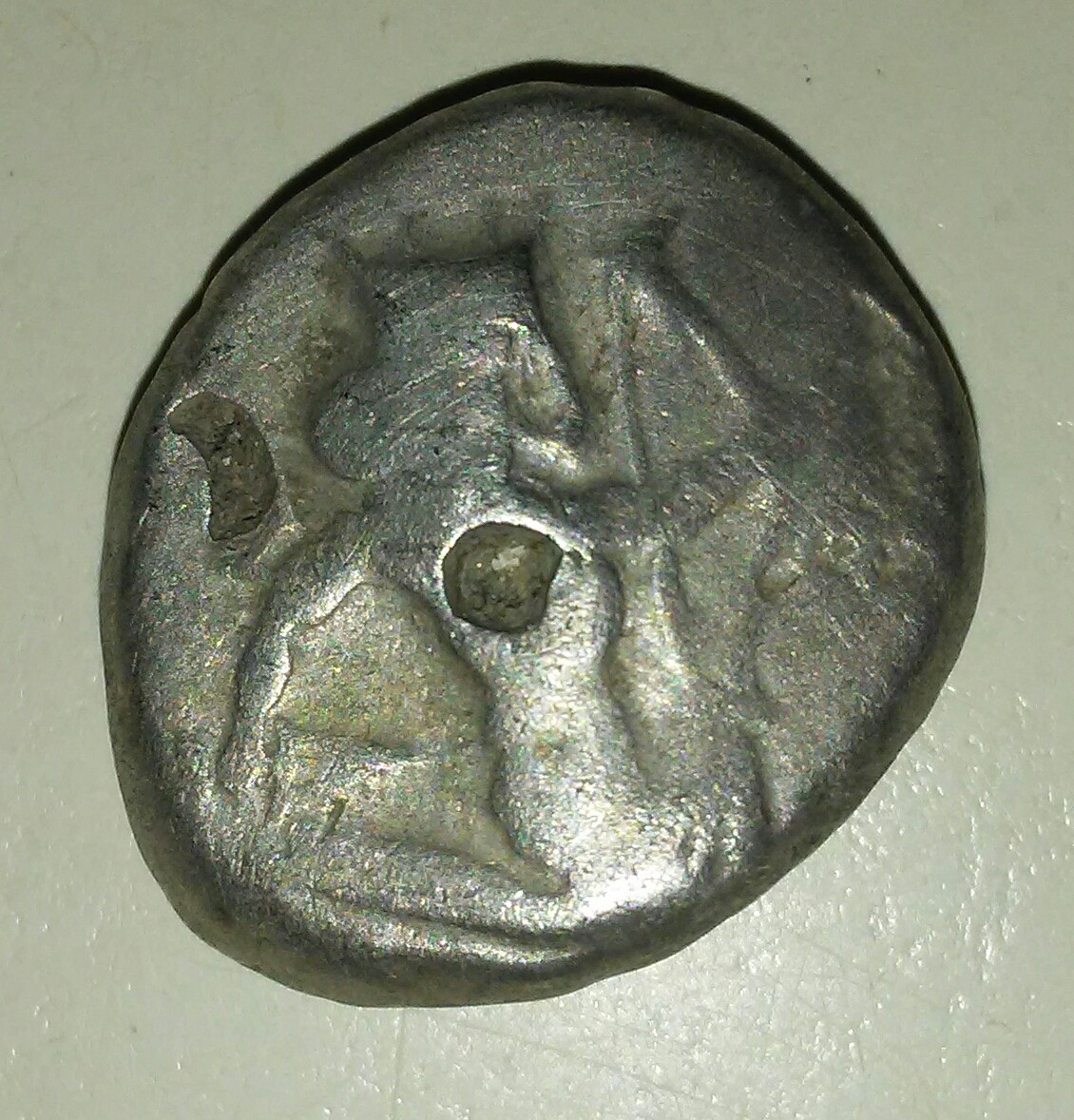 Congratulations on your virtual inkblot test. It bedeviled me. My first immediate thoughts there were phallic (maybe I should see a doc about that, huh). Then I tried to see your owl, but saw a pomegranate, instead. But that's not it, either. It's like a pomegranate on a femur bone. I have no clue! It's an intriguing mystery, though. So while we're discussing ancient mystery marks, I will submit these little doohickeys seen inside the quarters of the quadripartite punch on the reverse of this little Greek I once had. Any ideas? They look intentional, not random. I think I see some broccoli there. And a fish. Maybe a croissant.