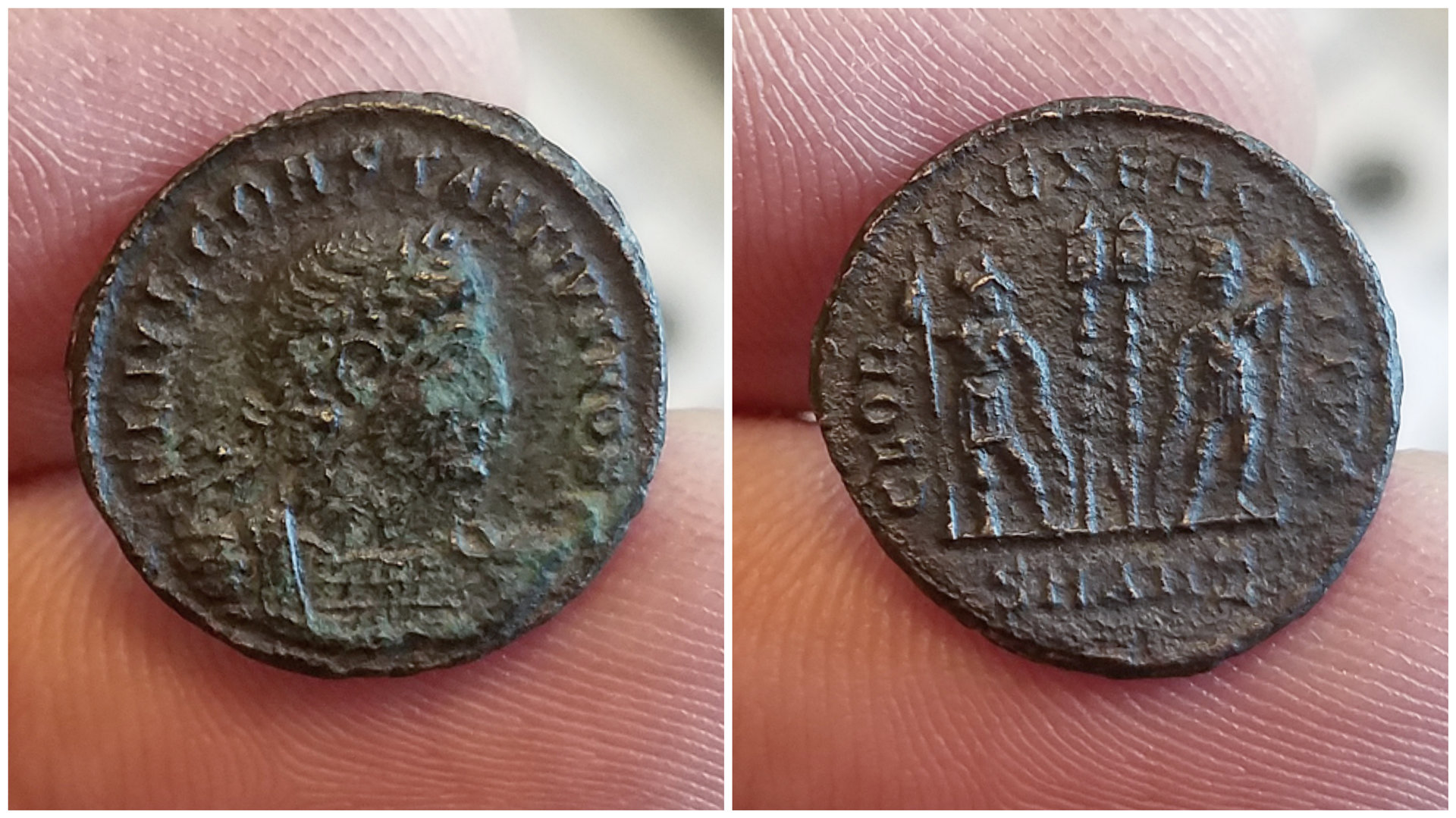 Fun thread @Justin Lee . I will share my Constantine II GLORIA EXERCITVS type from the Siscia mint. I bought this coin while in Israel from a dealer in the old city of Jerusalem. I overpaid, but in hindsight I would rather have this than any of the other tourist souvenirs I might have bought in its place. Roman Empire Constantine II as Caesar (AD 317 - 337) AE Follis, Siscia mint, struck ca. AD 330 - 333 Obv.: CONSTANTINVS IVN NOB C. Laureate, cuirassed bust right. Rev.: GLOR-IA EXERC-ITVS. Two soldiers standing, facing each other with spear in outer hand, inner hand on shield resting on ground; two standards between. Ref.: RIC VII 220 (Siscia)