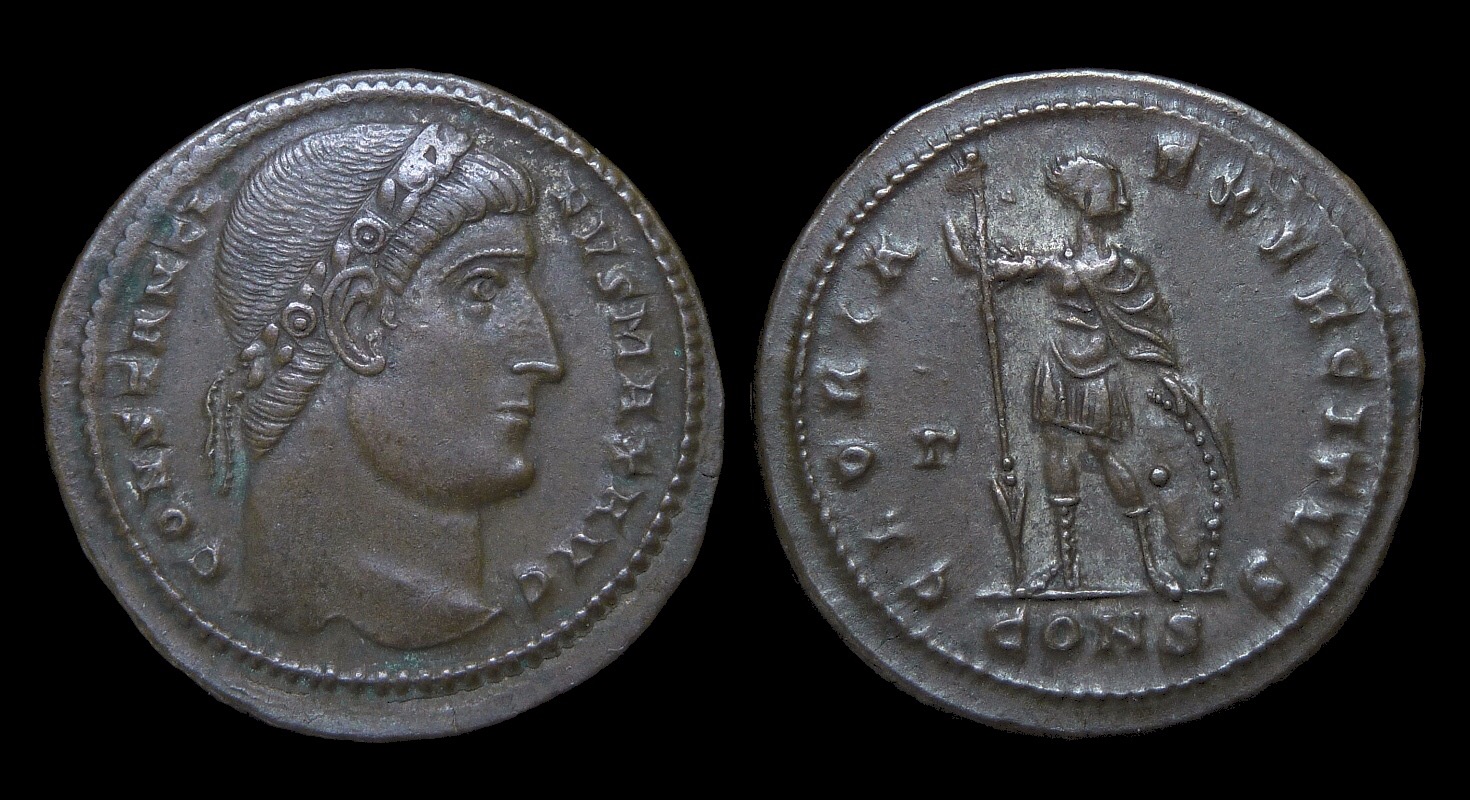 Really jealous of that Milvian Bridge, @TIF. This was bought some time ago, but I haven't posted it before. Probably my nicest Constantine I. CONSTANTINE I AE3. 3.4g, 21.3mm. Constantinople, AD 327-328. RIC VII Constantinople 22 (R3). O: CONSTANTI-NVS MAX AVG, rosette-diademed head right. R: GLORIA EXERCITVS, soldier standing left, looking right, holding spear and resting hand on shield; Γ in left field, CONS in exergue.