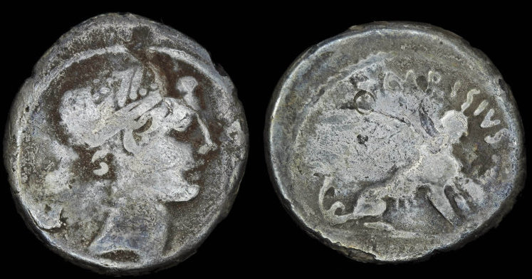Moneyer issues of Imperatorial Rome. T. Carisius. 46 BC. AR Denarius (20mm, 3.83 g, 3h). Rome mint. Head of Sibyl Herophile right, hair elaborately decorated with jewels and enclosed in a sling and tied with bands / Sphinx seated right. Crawford 464/1; CRI 69; Sydenham 983; Carisia 10. Good VF, toned, areas of flat strike.