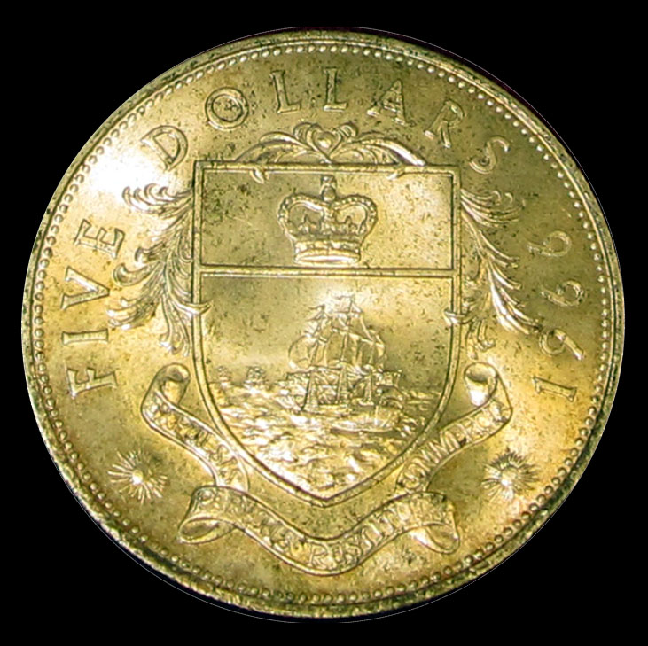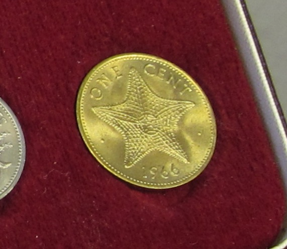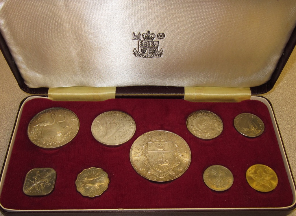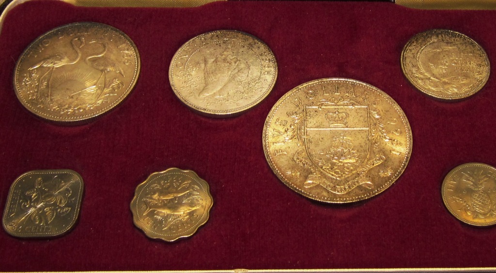 This weekend I purchased this 1966 coin set. According to the packaging, it was originally issued by the government of the Bahamas. There is a 3” x 5” card included which makes the following statement: These coins have been specially selected for quality at the time of manufacture by the Royal Mint in London. While discoloration from tarnishing may eventually occur, it does not affect the value of the coins and therefore, substitutions of replacements cannot be made - Ministry of Finance The silver coins are the 50-cent, 1-dollar, 2-dollar, and 5 dollar coins. These total 2.8721 ounces of silver. The dealer simply multiplied 2.8721 x $41 to come up with his sale pricefor the set. I believe silver is down today but it was $41.50 on this last weekend. I don’t know if the silver coins ever really circulated in the Bahamas. I am certain that the lower denomination coins (25 cent through 1 cent) have circulated on the islands at par with the US coins. If you have any other coin sets from the Bahamas, please post them.