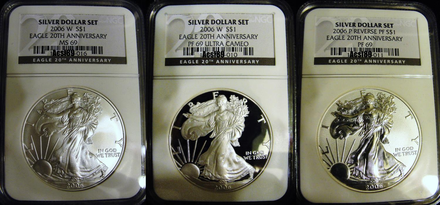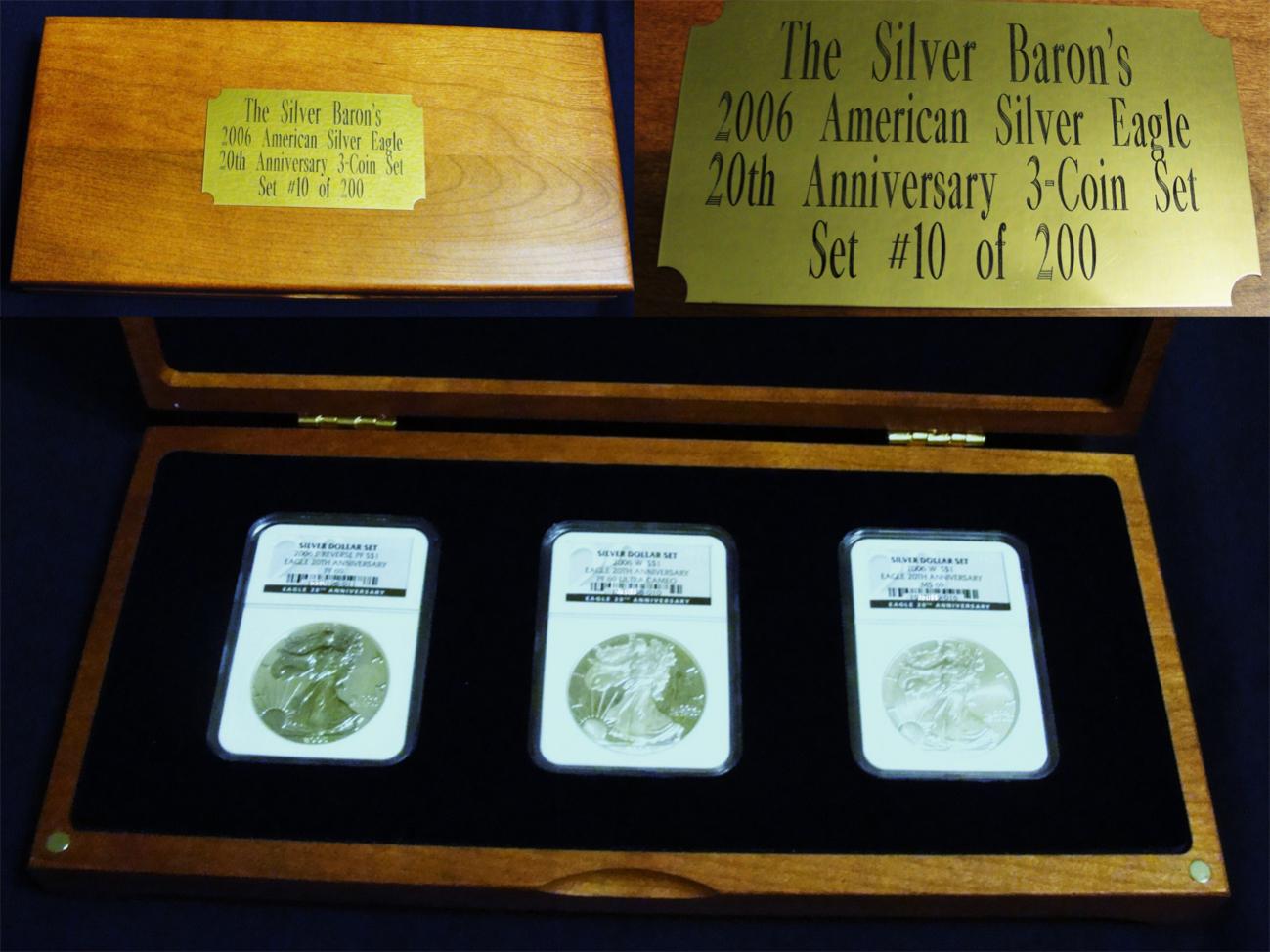 Hi, I was wondering if there is any significance to this 2006 silver eagle 20th anniversary set titled: "The Silver Baron's" I don't really know anything about the packaging but I do know the coins are a beauty... purchased it for $240...any info would be great..thanks=) I do know one thing..its #10 out of 200 sets made...and that the case is really nice,very heavy wood... and the pictures of the silver eagles: very clean/sharp details.... good luck and happy hunting... -acsf89