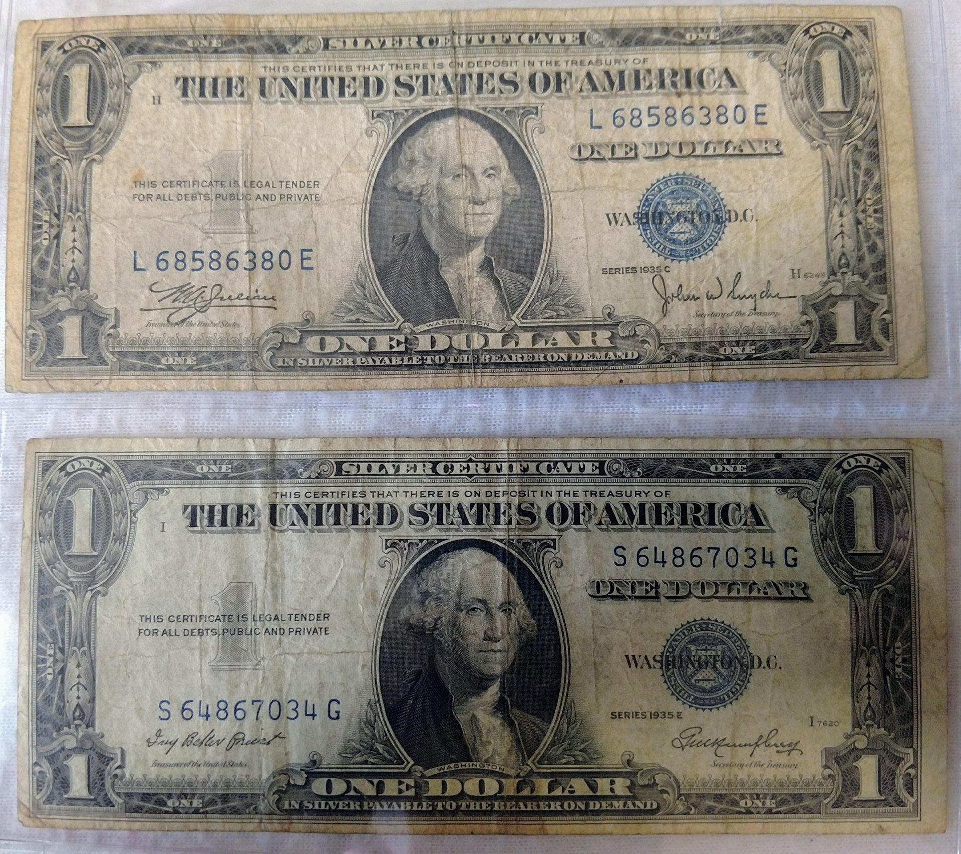 Good evening to my fellow night owls. This is my second post for the day on this forum. Just a quick feedback from you ladies and gents. I purchased two 1935 Silver Cert dollar bills last night for $4 . The condition is less to be desired though, I was very excited just the same as this is my first bill purchase. Just want to get your take about the price I paid for it. Was the price fair enough for the both me and the seller? I think this type of paper currency hunting will likely be a new addition on to my hunt. I uploaded the image of both dollar bills. Comments, feedback and inputs will be greatly appreciated. Thanks in advance.