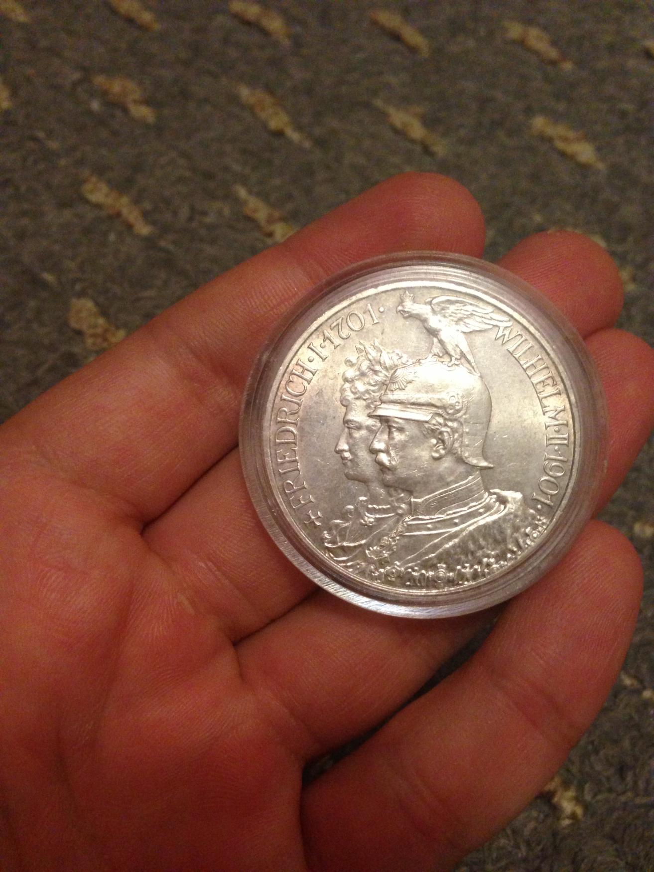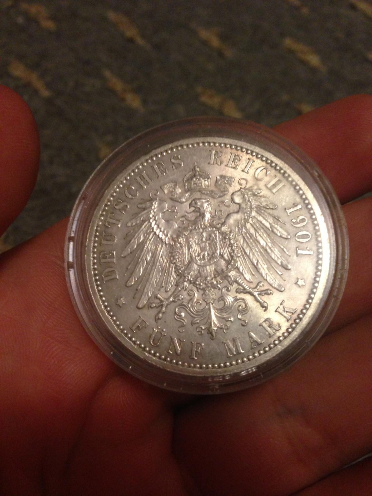 Up First is a Gem bu 1901 Prussian 5 Mark Piece. My Price is $115 shipped Up Second is an XF/AU 1861 German Thaler. My Price is $65 shipped I also have an au 1862 thaler as well as a cleaned German rupiee and a cleaned low relief Cuban peso up for sale if anyone is interested. Pictures can be found http://s1209.photobucket.com/albums/cc382/aldy2gee/Alternate/ -I am also willing to consider offers for trades with bullion/other numismatica. Thank you for your interest. -Rest assured while I am not an ideal photographer each coin has been stored under proper conditions; inside a static bag to absorb the sulfur from the air as well as with silica gel. The air tights are acrylic, pvc free and ideal for present and future storage. Happy holidays and thank you for your interest