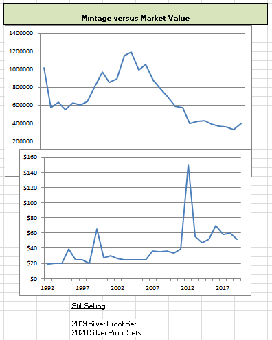 With the release of the 2020 silver proof set, I thought it time for another update of the silver proof sets (value vs mintage) from 1992 to present. The values of the sets seem to have risen since the last update in January 2019. It is probably related to the price of silver, which went up 15% in 2019. The 2012 set did see some reduction in value, but is still the star of this show. The 1999 set continues it decent and now sits at just $65. The 2018 set has the lowest mintage of any set since 1992 at just 332,274. It will be interesting to see if its value increases with time. The mintage of 2019 set rebounded from the nadir of 2018 probably as a result of the 2019-W reverse proof cent and the increase in silver content of the silver coins to 99.9%. The COVID-19 may play some havoc with the 2020 release and sales but the W reverse proof nickel may help save the day for this set. The price increase to $63.25 is unsettling in these troubled times. A table and chart for your viewing pleasure: