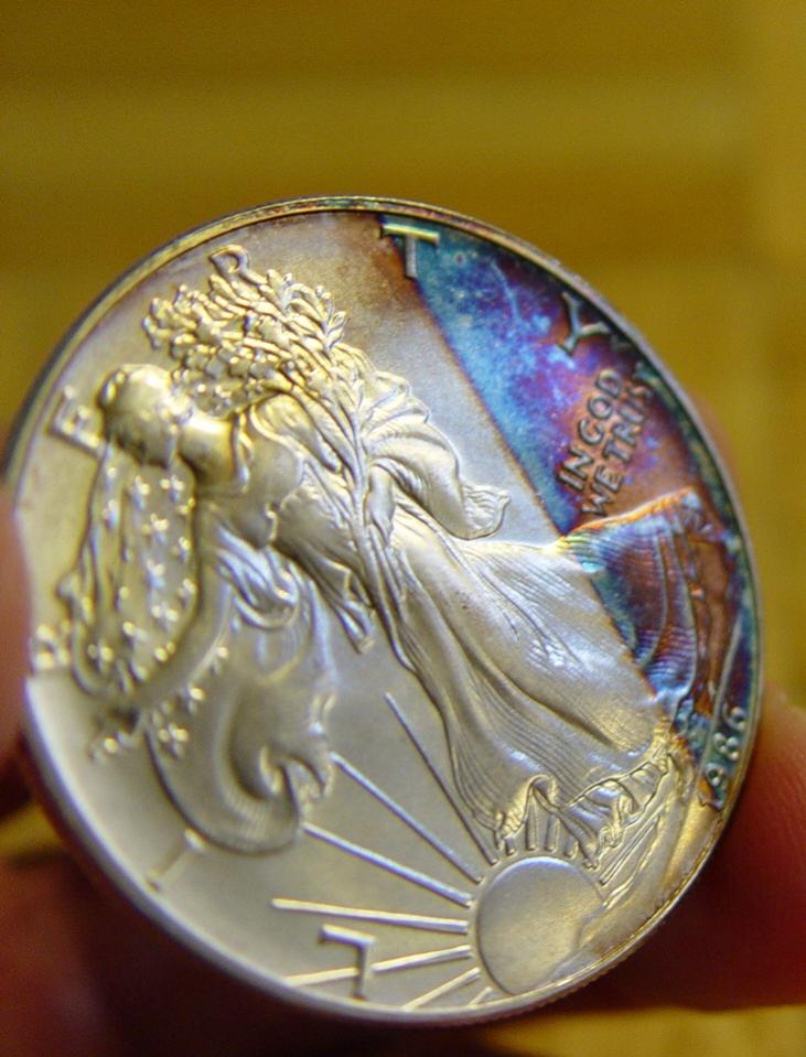 Single sided toning is also extremely common on silver dollars that had been in bags for years. The side next to the bag would tone in bright colors; the side opposite would remain white. This is a textbook example of a GSA dollar toned on one side: http://coins.ha.com/c/item.zx?saleNo=1169&lotIdNo=40209
