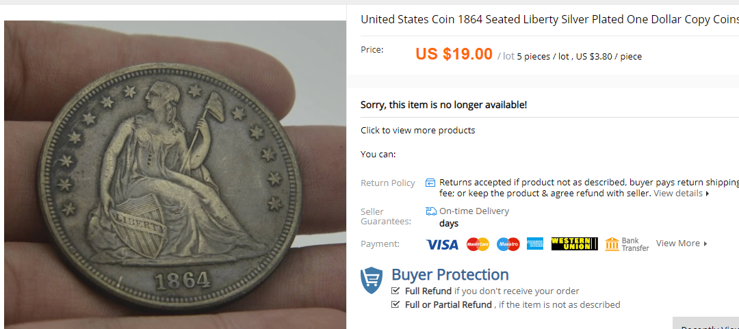 I have recently returned to coin collecting, and my wife thought she'd surprise me with a new/old one. So she bought an 1864 Sitting Liberty coin from the Far East, and this without my knowing about it. The coin arrived today, so I started to try to figure out how to grade it, when a couple of small details caught my attention. I'm going to post my pictures, but hopefully you can get yours from other sources. I used the Mega Red Book. Initially, on the Obverse I find the mouth to be opened wider than a correct coin. On the Reverse, I saw some discrepancies in wing positions, and possibly the beak being more opened than it should be. I know that everything gets counterfeited in some countries, and based on about how much she spent, I don't think that all's well with this coin. I didn't grade it very high, but there was enough detail that the Red Book showed well into the triple digits - my eye is very untrained though, and she spent a couple sawbucks at the most. I would appreciate any help that folks could give.