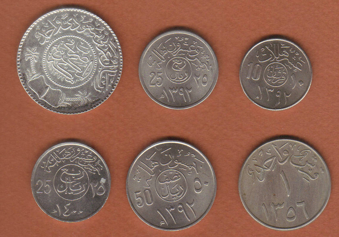Six coins of Saudi Arabia (largest coin is silver)