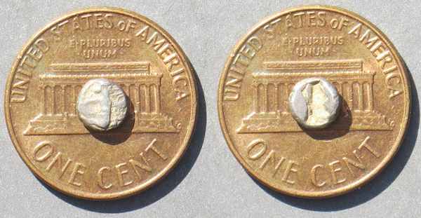Meantime, I found two new tinyminy fractional sigloi. Here they are having a good time together on the Lincoln Memorial. 1. Achaemenid Empire. Time of Xerxes II to Artaxerxes II (c.420-375 BC), 1/32 siglos. Obv. Persian king or hero, with quiver over shoulder, in kneeling-running stance right, drawing bow. (Though I can see only his upper part: he might even been smoking a pipe.) Rev. Incuse hollow. 5 mm, 0.17 gr. Carradice Type IV (I'm afraid I can't see this). 2. Achaemenid era, local issues - a nice marriage between a Greek and a Persian coin. 4th century, probably about 380-350 BC (estimate after reading the introduction to the Sunrise catalog). Tetartemorion. Uncertain mint in Cilicia? That's the coastal area around Tarsus then and Adana now, in the corner of the Mediterranean Sea. Obv. Persian king or hero, in kneeling-running stance right, holding dagger and bow. (Again, you only see his upper part, with expressive long arms). Rev. Hair-circled head facing slightly left in incuse field. 5 mm, 0.18 mm. Cf. Sunrise 98. I'm happy the seller managed to make really excellent photographs of these minuscules.