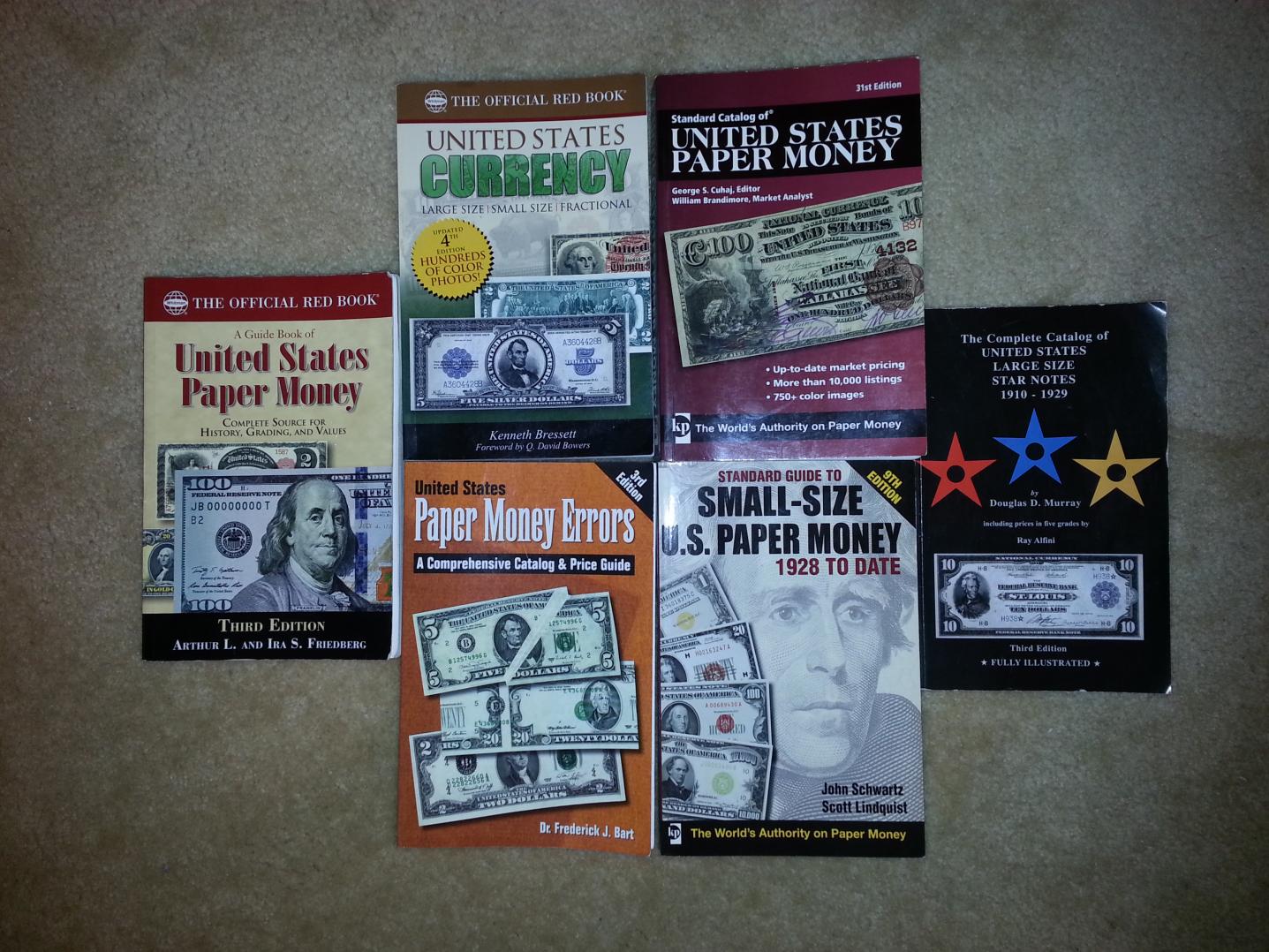 Here are some that I use. I also use ha.com to view past auctions, as well as the Track & Price census program. I recommend the Standard catalog of United States Paper Money in the image above. However the values are higher than the market today. I would say the prices are about 20% too high. But that is normal with most books.