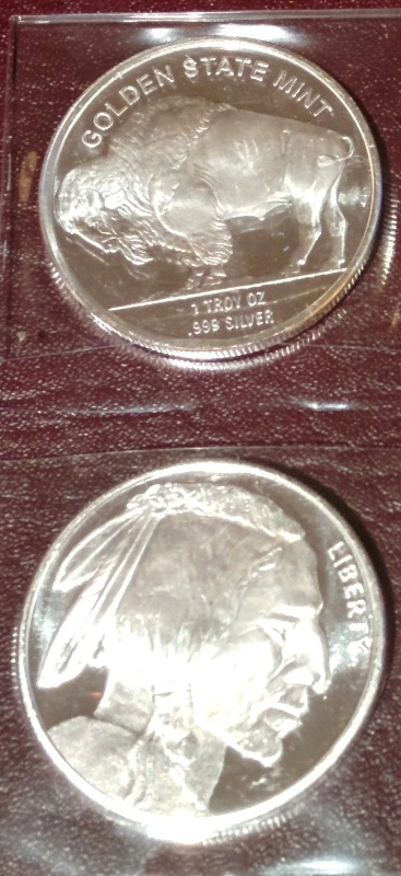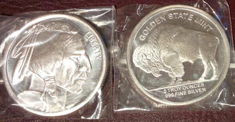 ALL SOLD! I have for sale several silver bullion rounds from Golden State Mint. All are .999 fine and have an Indian Head obverse and Buffalo reverse design. They are not dated, but I purchased them in 2013. Asking $22 each for the 1 oz rounds, 3 available. Asking $110 for the 5 oz round, 1 available. Adding 2 1 oz American Silver Eagles. 2005 BU (relatively low mintage--just under 9 mil). $25 each. Shipping USPS $2 for a 1 oz coin, add $0.50 for each additional. $2.99 for the 5 oz. Actual cost negotiable if you buy all. Paypal OK, but add 3%. Postal Money order preferred. Thanks. 1 oz 5 oz Rob