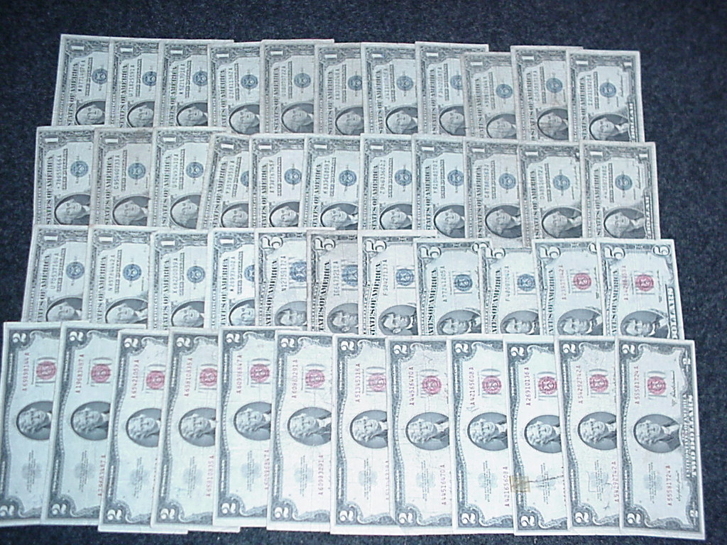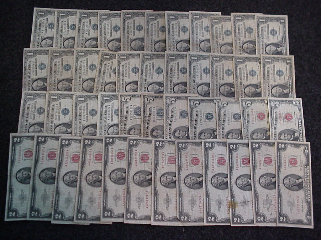 Sold. Forty-five old Silver Certificates and Legal Tender Notes (United States Notes) for $100 includes USPS Priority Mail shipping. Face value $85. Oldest $1 Certificate is 1935D; $5 Certificate 1934A, $2 1953, and $5 US Note 1963. One of the later $5 Certificates has a bit torn off (third from right as shown) and one of the $2 notes is ripped and taped (third from the left as shown). The picture w/o flash is a better representation of how the notes actually look.