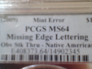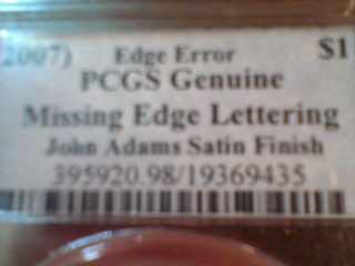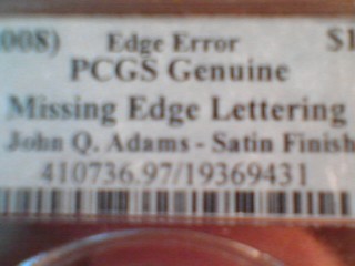 Heres some pretty rare errors I have up for auction right now Sorry I cant take good pics right now..so Ill just show labels for now Heres a satin(not business strike) sms 2008 Adams dollar graded by PCGS Heres another satin sms Adams missing edge error. this ones 2007 It also has a small grease strike through that was not acknowledged by PCGS Last one is a 2009 sac thats a double error. Missing edge lettering and Obverse strike through PCGS MS64 strike through the babys head! Since these coins are all probably 1 of 1, Im having a hard time estimating values? If anybody could provide some insight on this, please let me know!