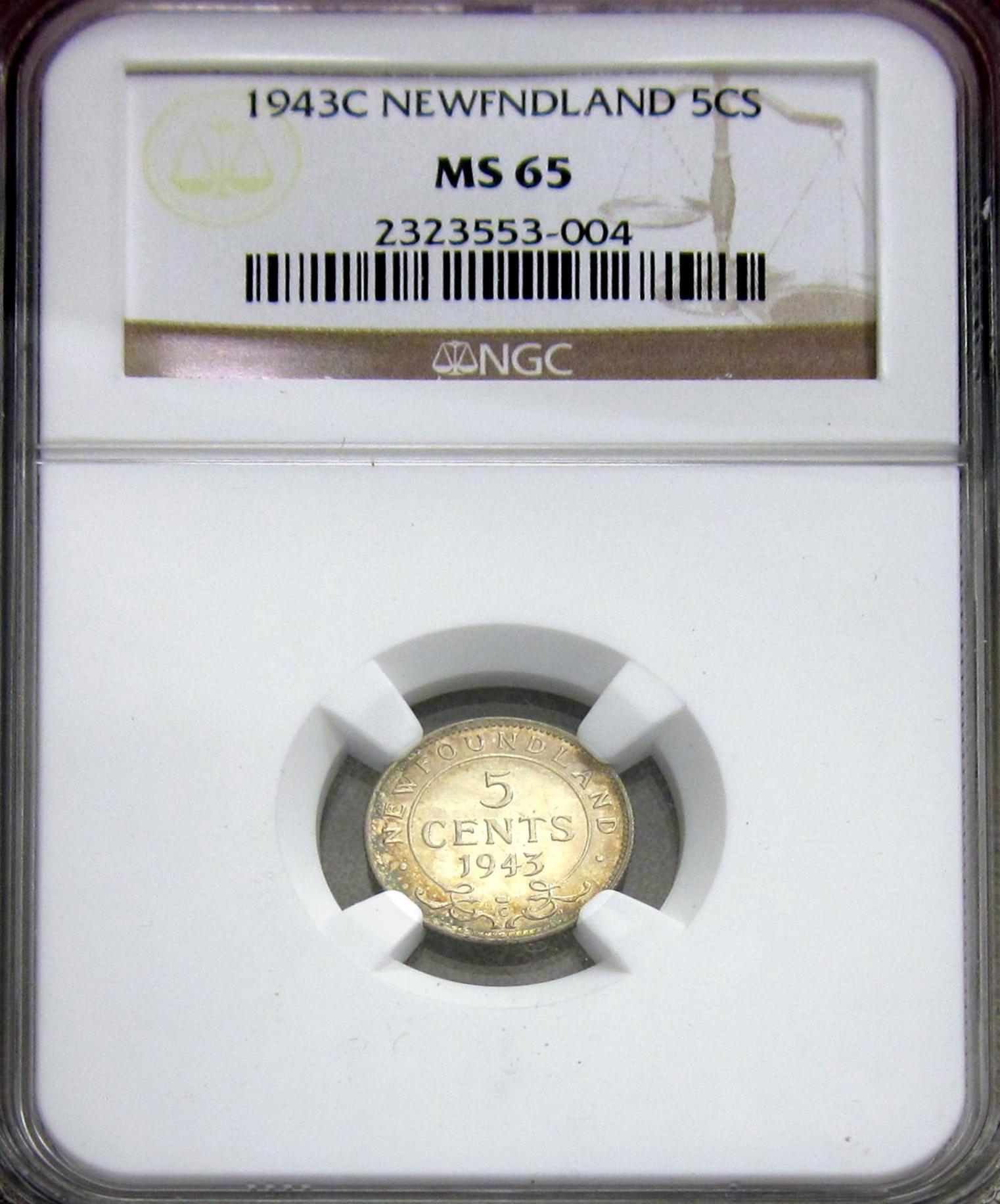 The fourth coin is a flashy 1943C Newfoundland silver 5-cent. It has the look of an MS65 or better. The NGC opinion is MS65. This is another war-era coin & they only made about 350,000 of these half-dimes. Please post some of your Canadian coins & thanks for letting me share.