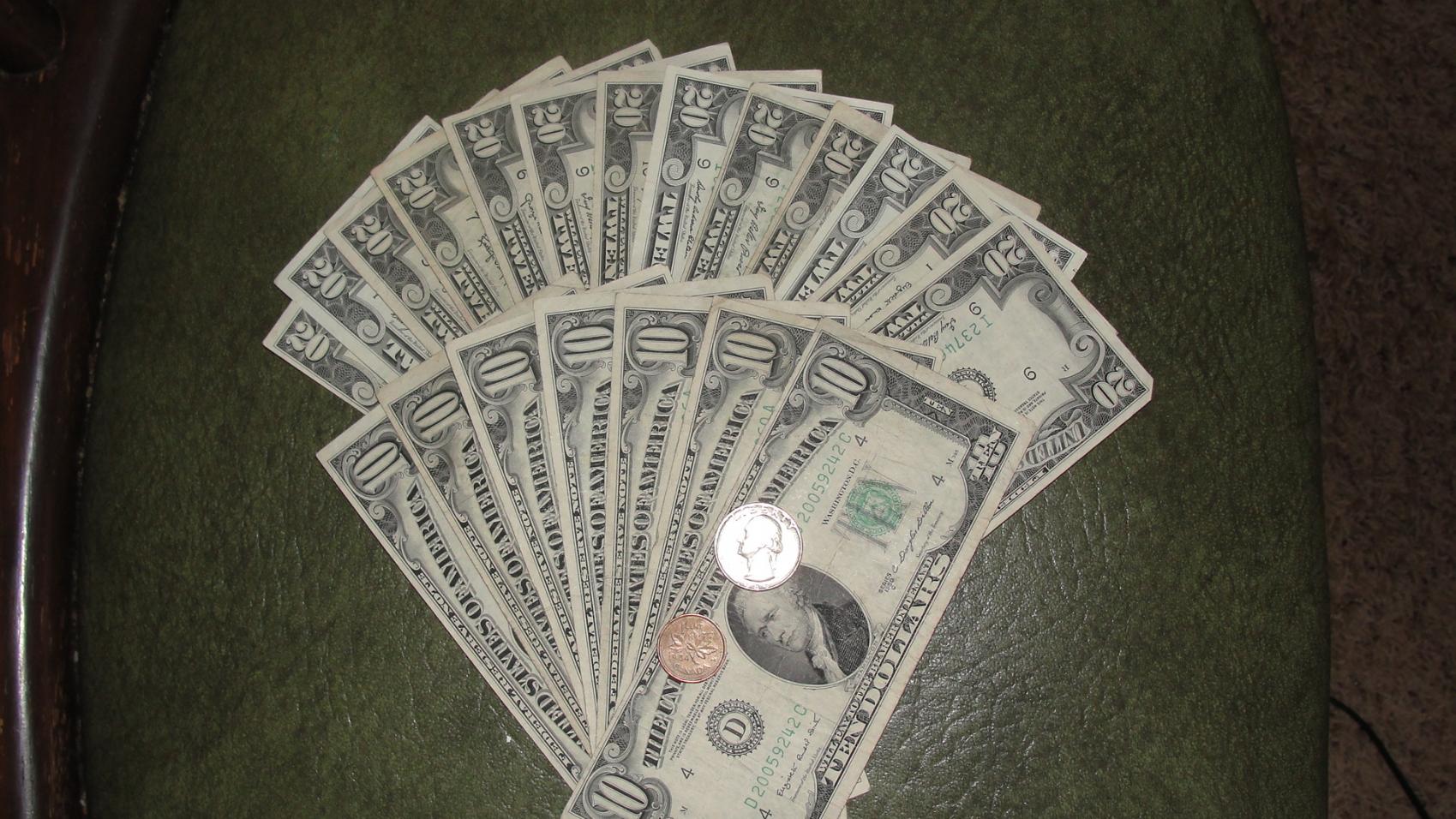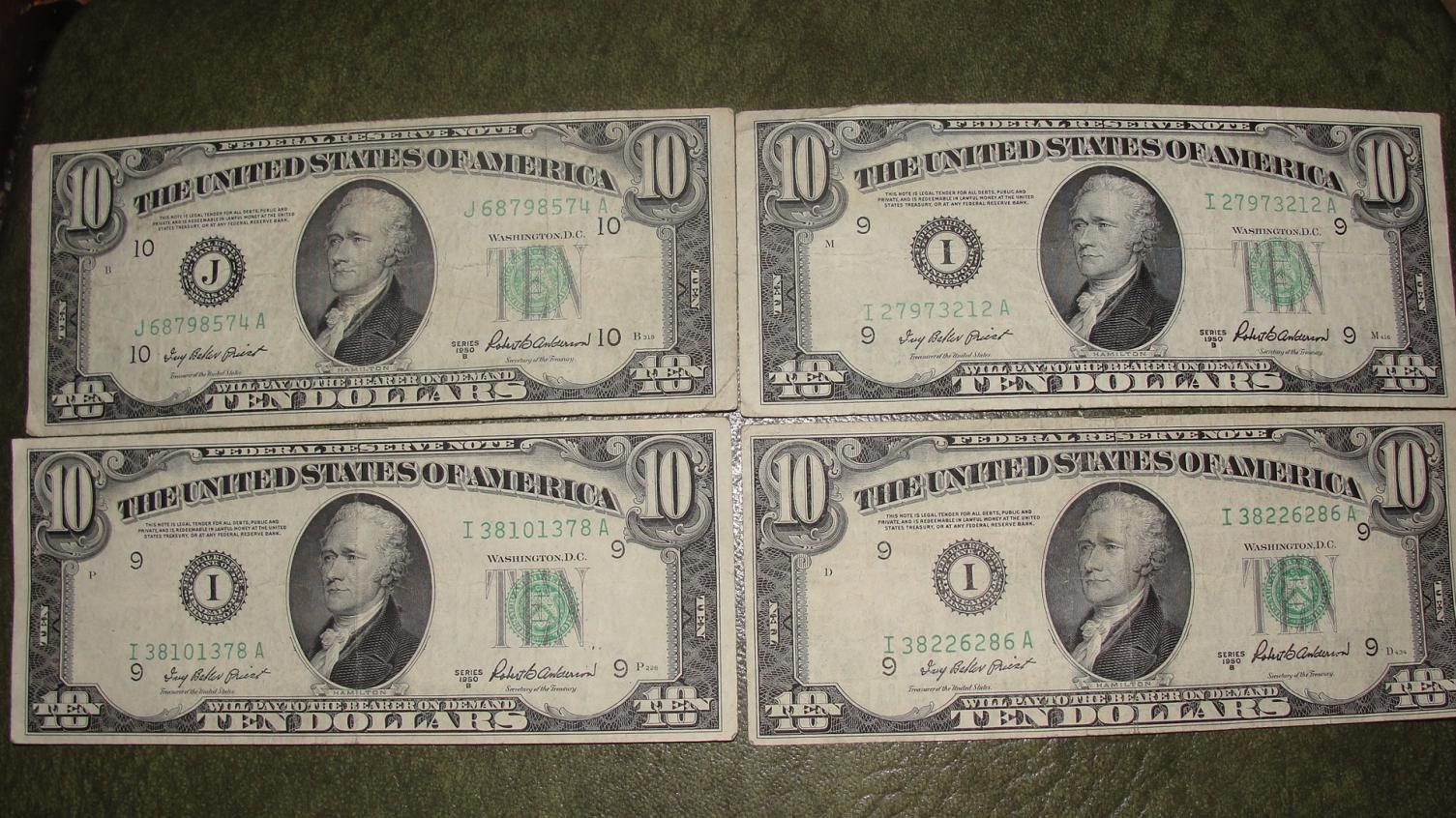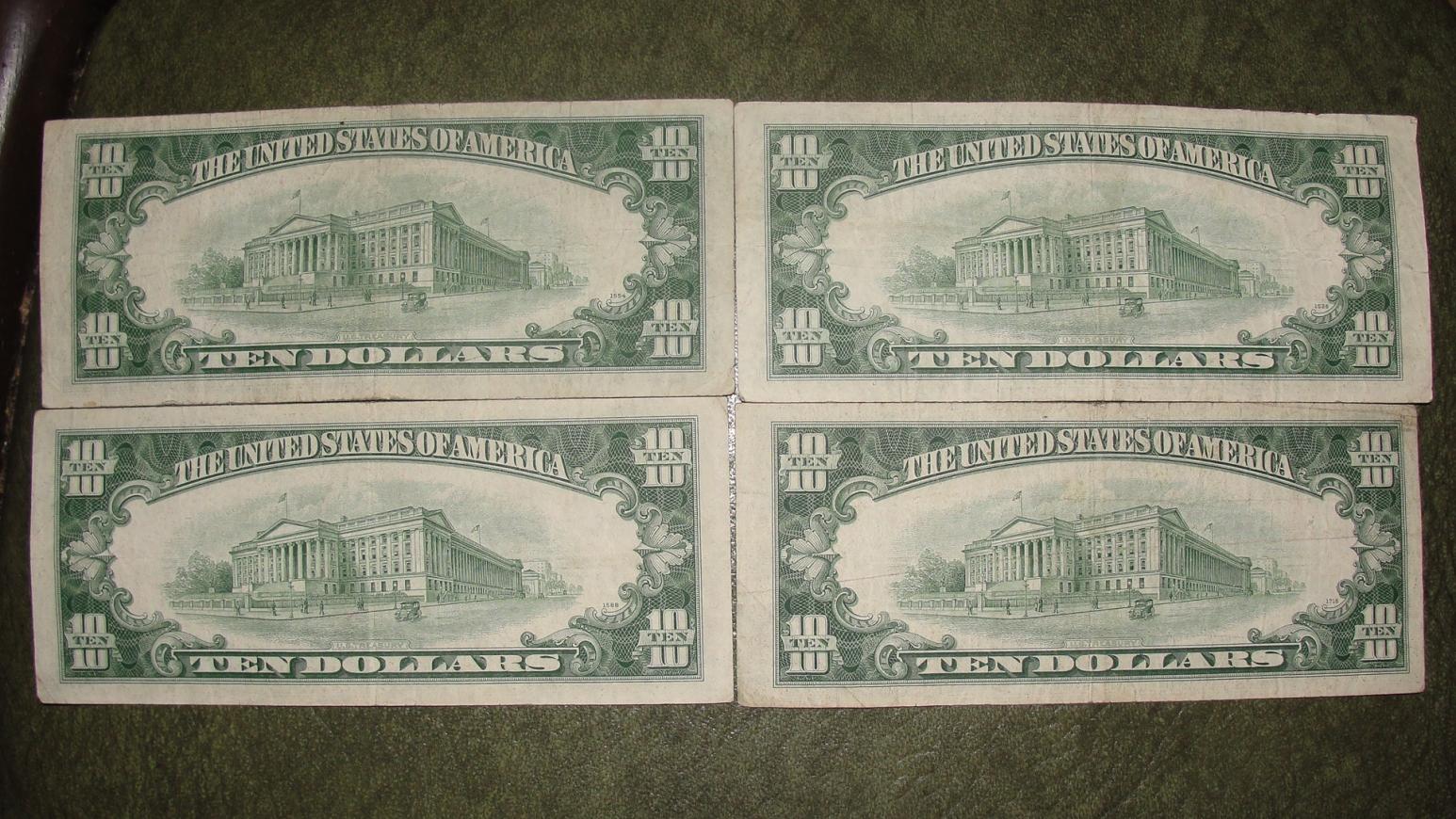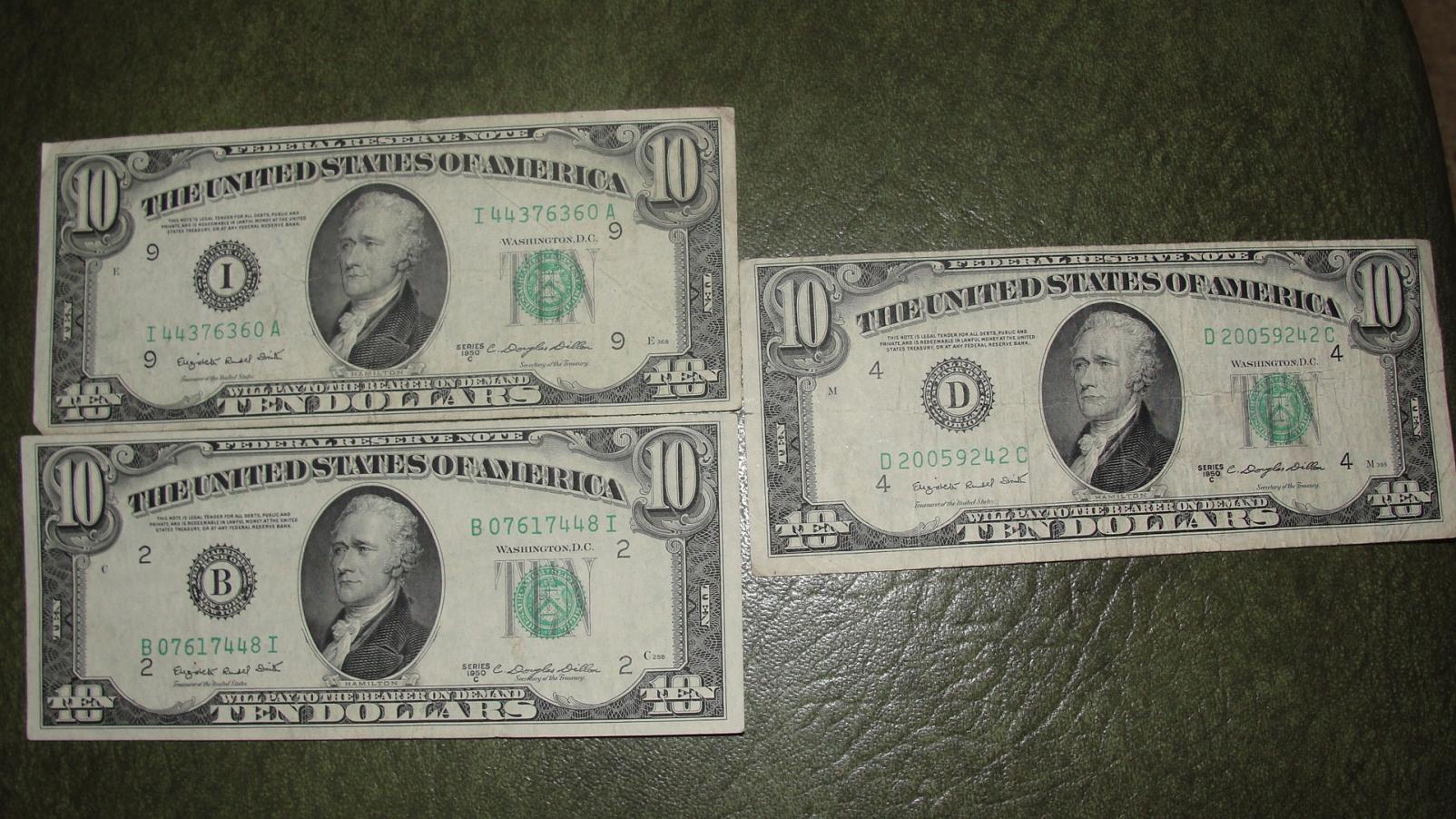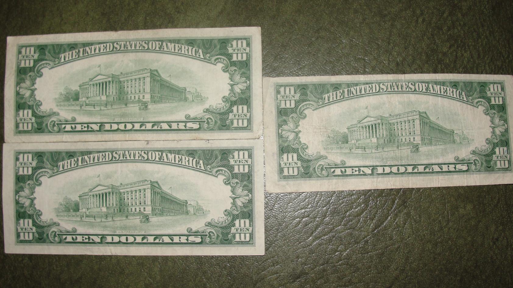 Ok, so first of all, my son hid my wallet in the dirty clothes hamper. So I had to cash my paycheck with a teller I know personally. I found a girl I went to high school with, and the deal was done. Then, as an afterthought, I said, "I know you guys all pick out the silver coins so I can never find any. What about old paper money? Some of you save that too or what?" She says, "Yeah I pick it out, but I don't save it. I set it aside for people like you!" So I say, "I'll take all ya got!" (Generally unwise to declare loudly at the bank, to a teller.... ) She pulls out $330 face in tens and twenties! Awesome! But I needed money for bills, so.... I pulled a side job for the extra cash :thumb: Anyone who knows me knows that if they need a building moved, raised and levelled, etc. I'm the guy, so another guy and I worked for four hours to move a 12'X16'X15' shed.... that had been previously cut in half :dismay: but it was easy money. Now I'm sitting on the stack, unsure what to do. Does anyone have printing figures for these notes? The quarter in the photo looks like someone just cut it out of a mint set. The Canadian cent... looked like a possible strike through, but once I saw it next to another of the same year I decided it was nothing and I wouldn't waste peoples' time with it First here are the $10's (4) series 1950B, (3) series 1950C
